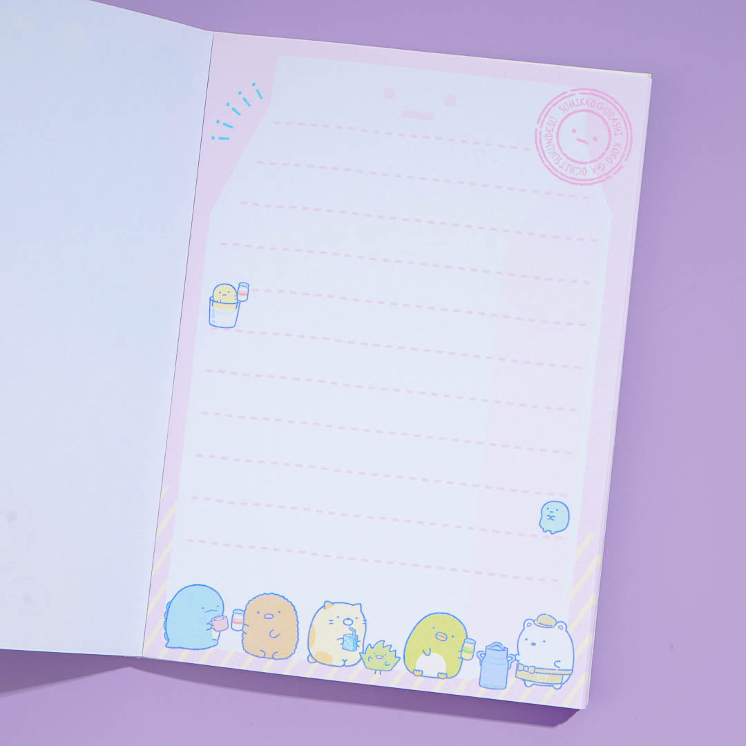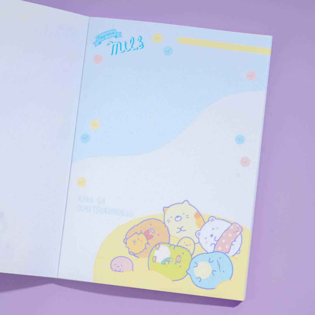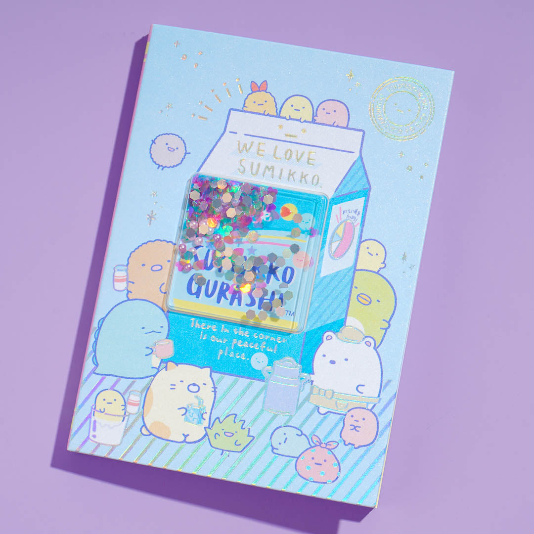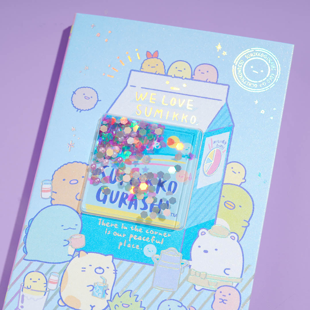 This kawaii memo pad is illustrated with prints of the Sumikko Gurashi gang surrounding a giant drink! It has a cover with a transparent section filled with beads and glitter that shake when you move the memo pad around. Use it to write down important notes and reminders.
