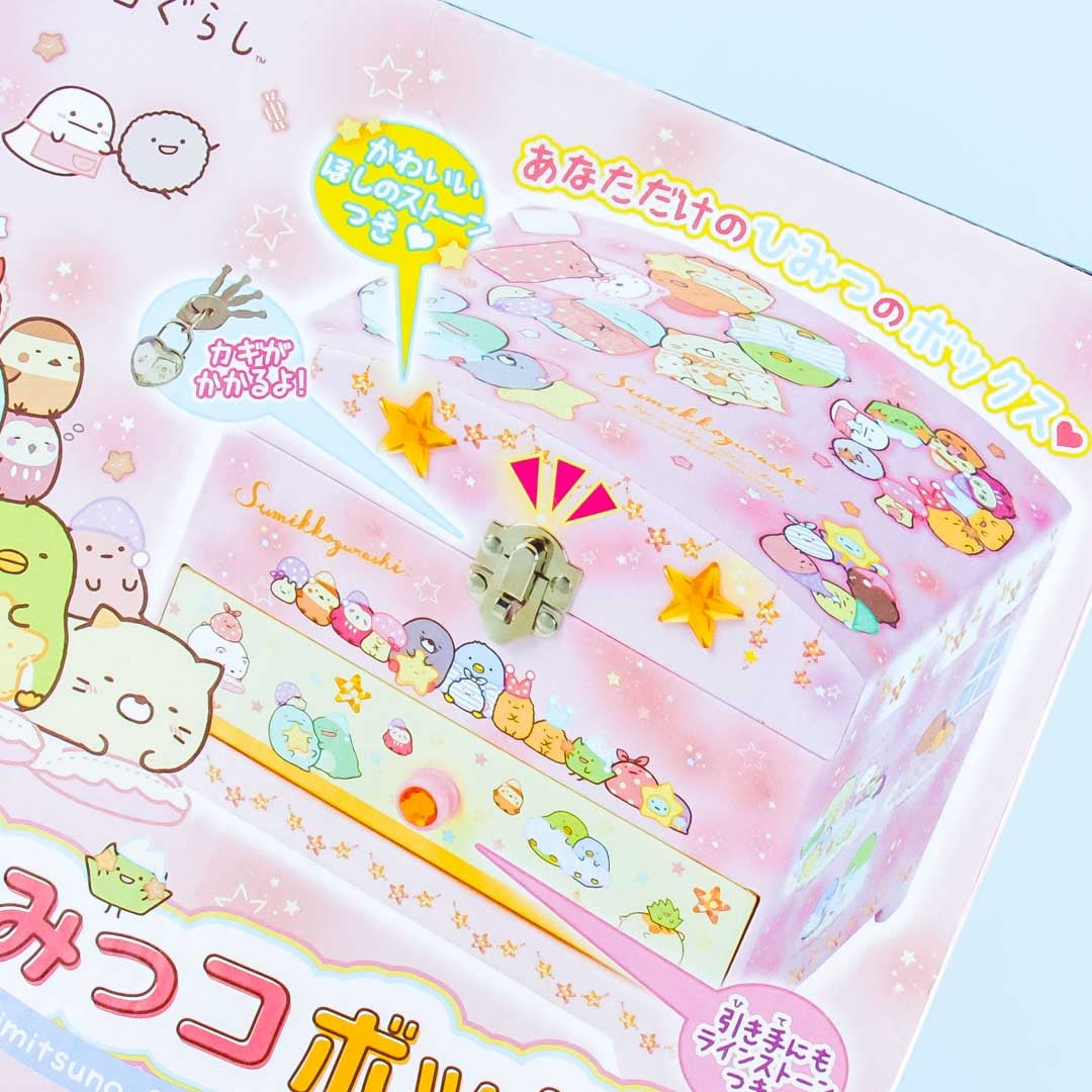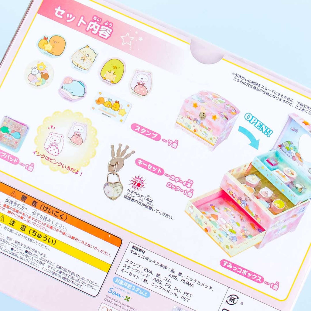 Have fun decorating your art projects with this super kawaii stamp set featuring the Sumikko Gurashi gang getting ready to sleep! This stamp set is complete with stamps, a stamp pad, keys, and a lock. They all come inside a jewelry box with a heart-shaped mirror inside.