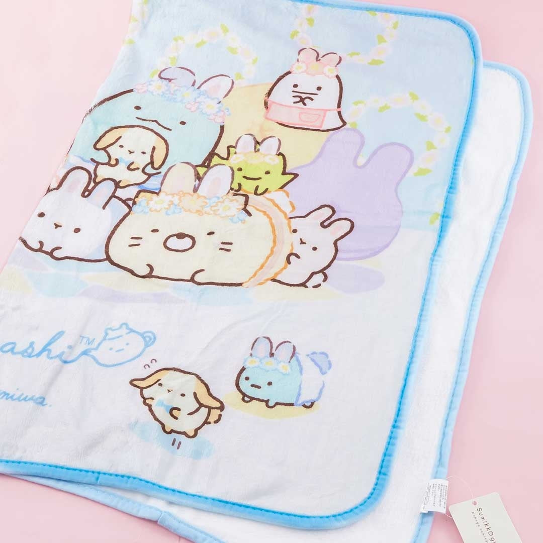 • A super cute flannel blanket featuring Sumikko Gurashi characters in spring bunny costumes