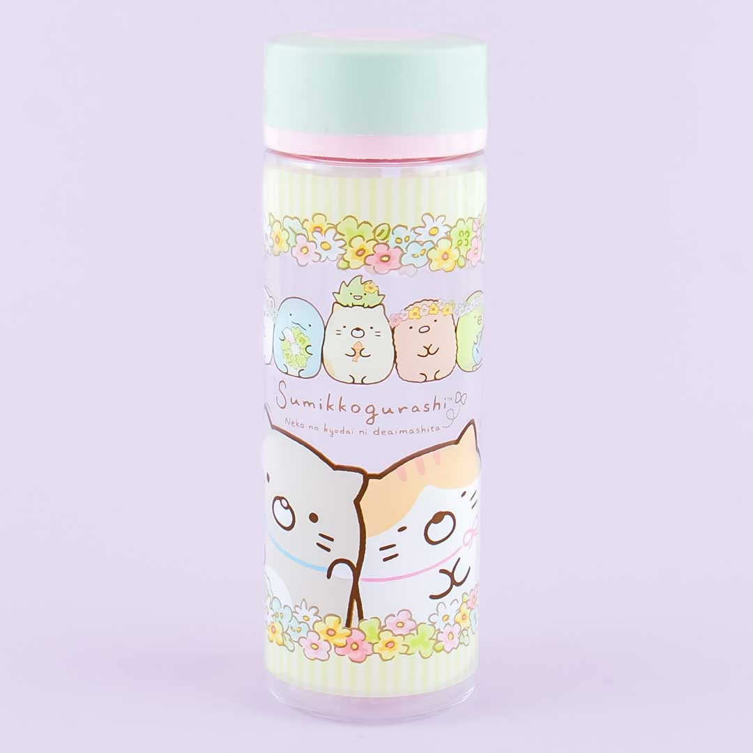 • A clear drinking bottle with illustrations of Sumikko Gurashi characters and spring flowers