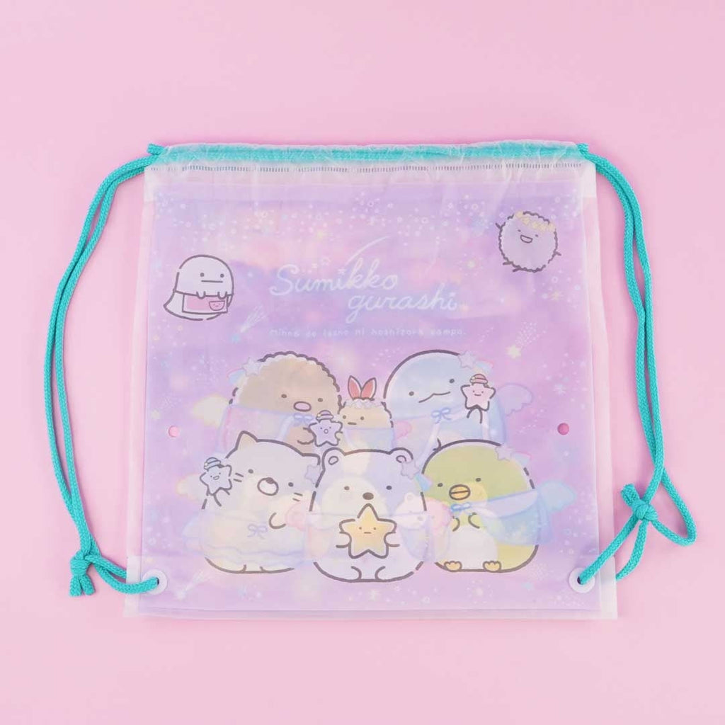 A plastic knapsack with 3 bags of assorted snacks featuring the Sumikko Gurashi characters stargazing
