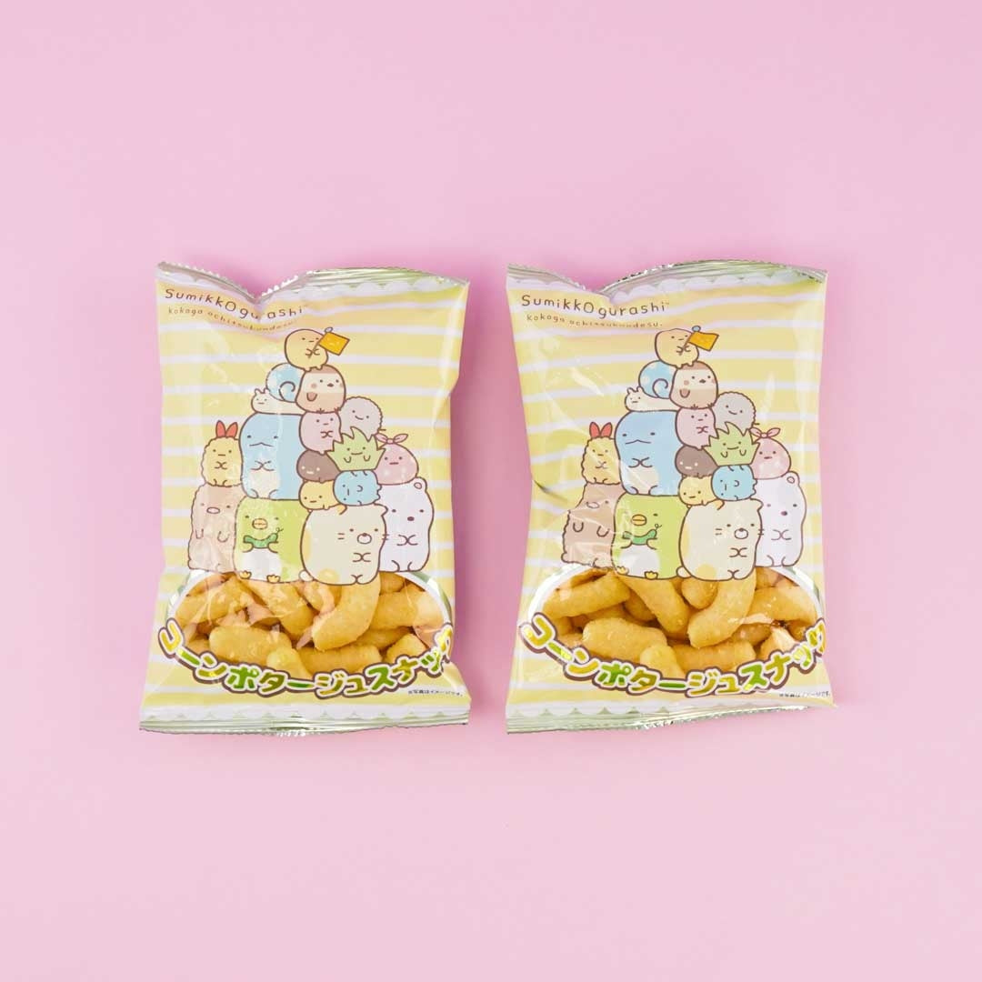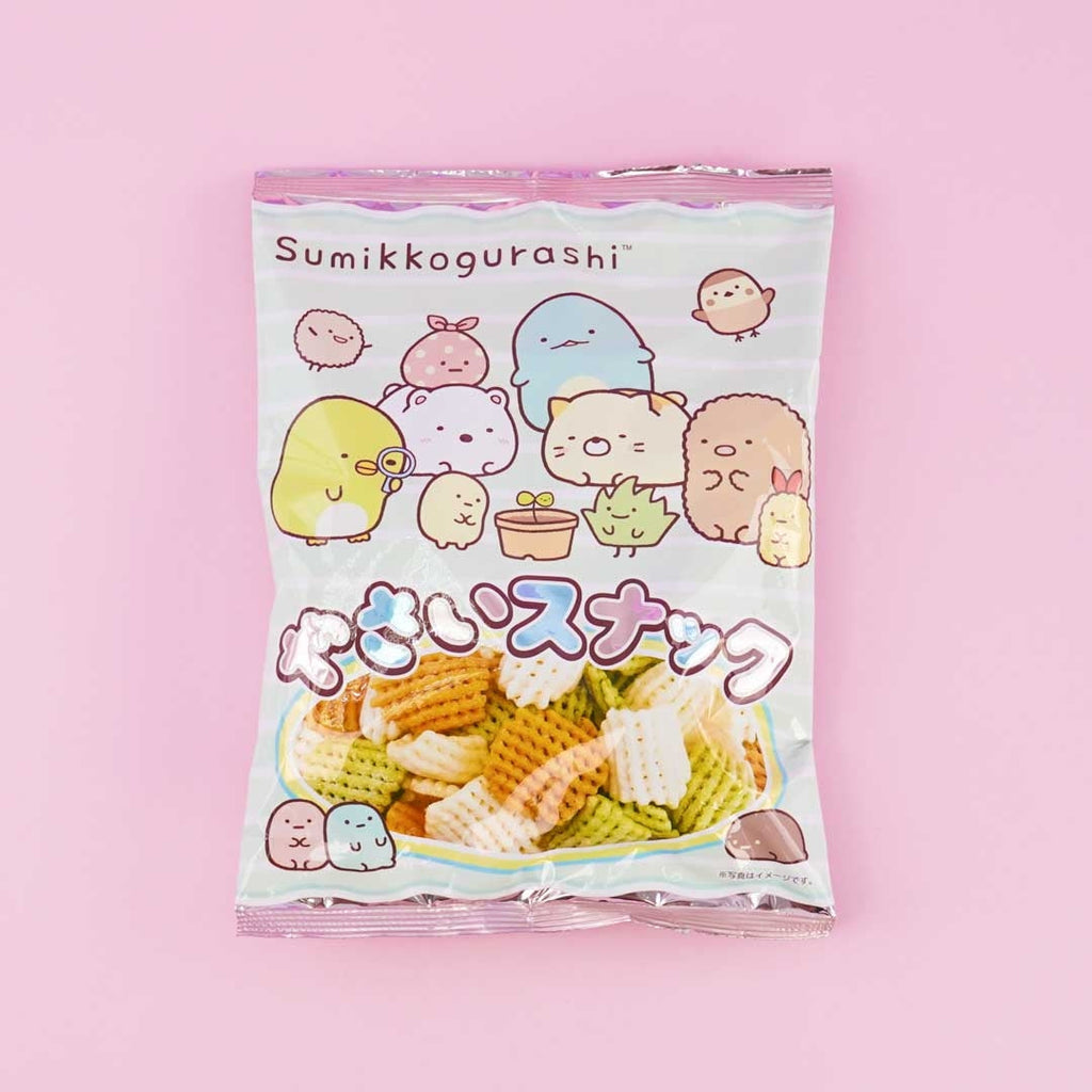 Bring this plastic Sumikko Gurashi knapsack with you to your next picnic! It includes three bags of assorted crunchy puffed and crisscross-shaped snacks and is decorated with an illustration of the Sumikko Gurashi gang stargazing together.