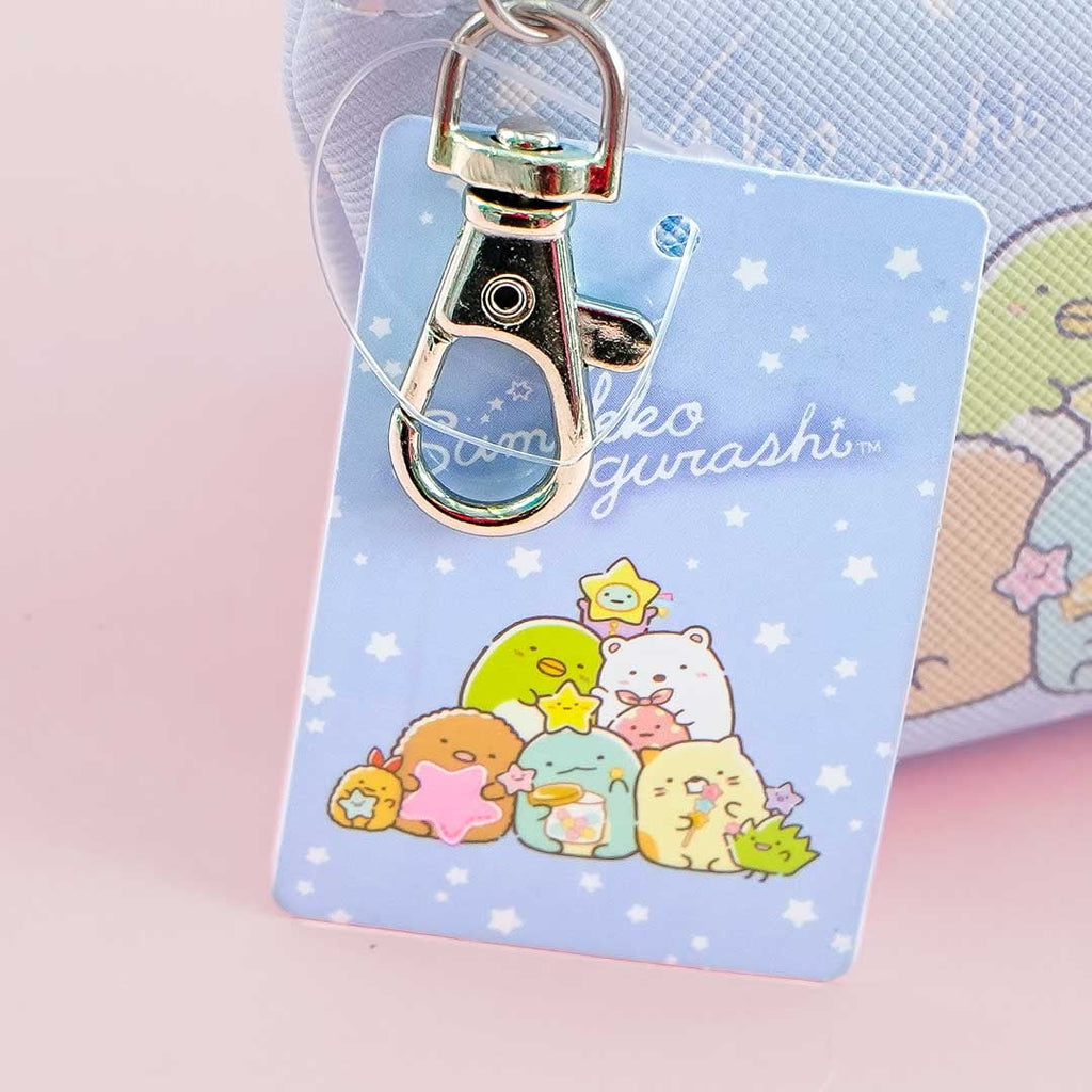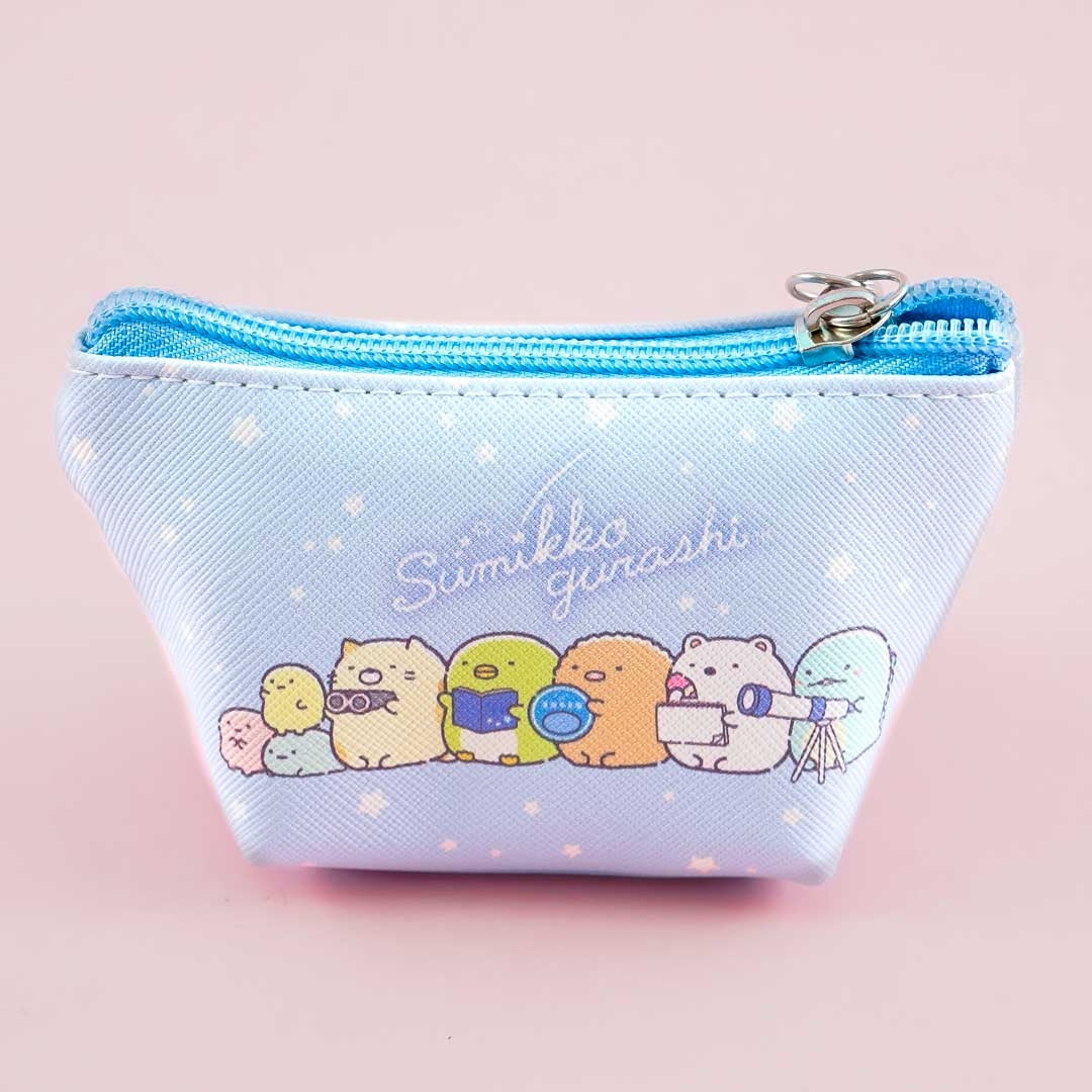 A small-sized pouch with a cute illustration of the Sumikko Gurashi gang having camp for stargazing