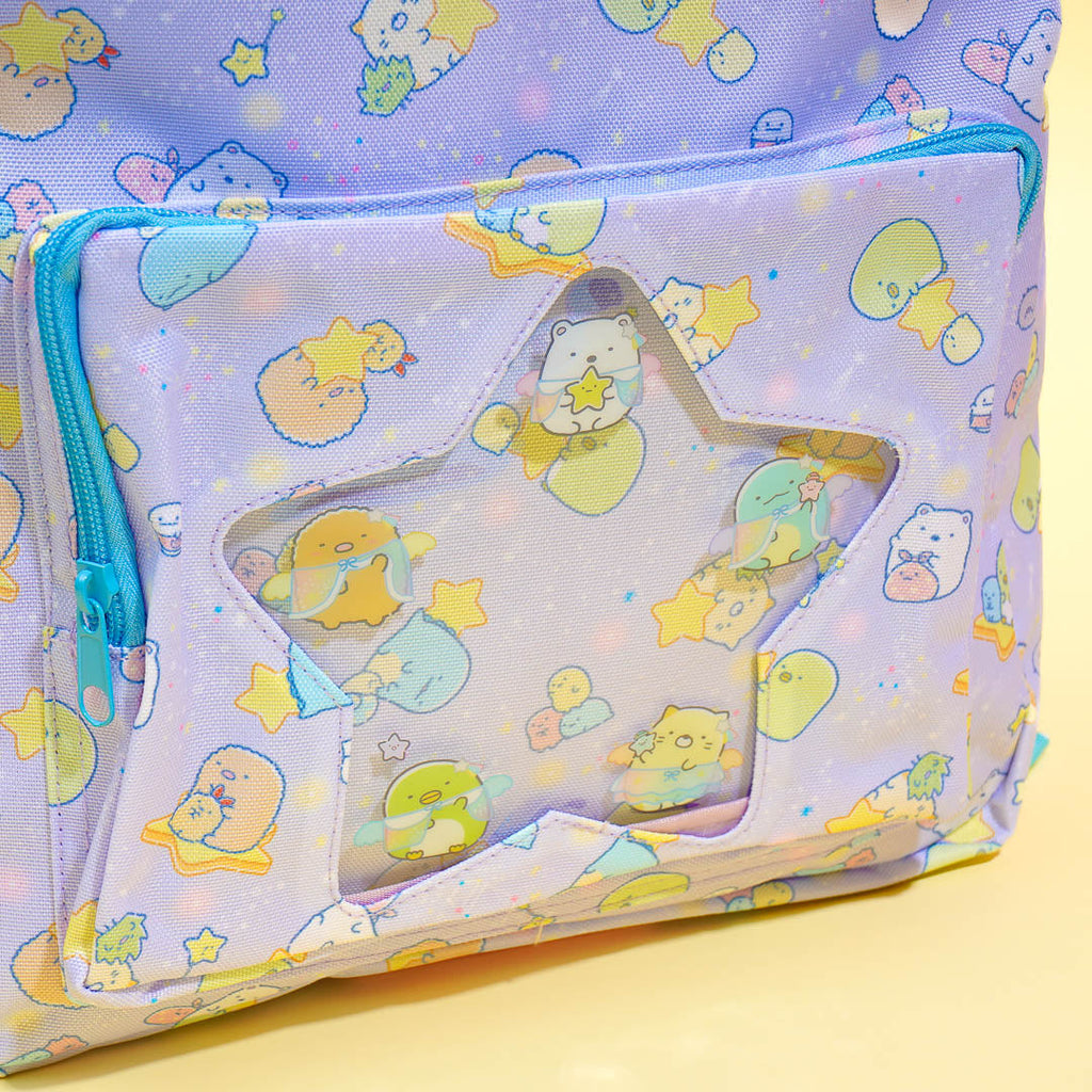 This kawaii backpack is covered with prints of Sumikko Gurashi playing with stars! It features a front pocket with a star-shaped transparent window. This bag has a large capacity so it's perfect for traveling!