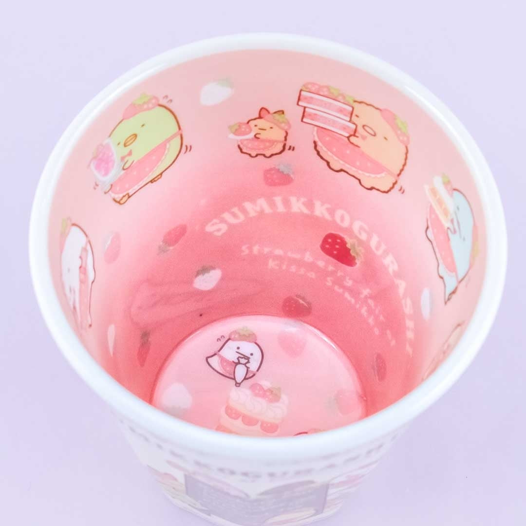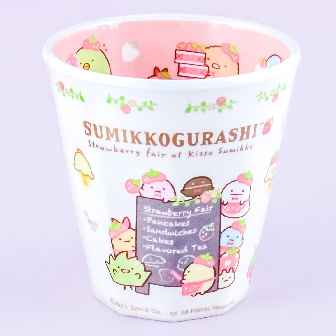 Fill up this cute cup made of sturdy melamine with your favorite hot or cold beverage! It features an illustration of the Sumikko Gurashi gang having fun at the strawberry fair! This kawaii cup is not compatible with microwave use.
