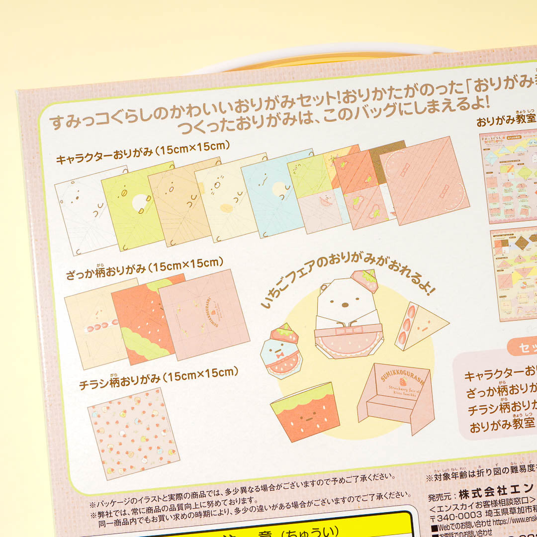 Have fun playing with your friends using this origami set! It features the Sumikko Gurashi in Strawberry Fair costumes. It includes characters, accessories, and flyer patterns, plus a detailed instruction in Japanese to guide you!