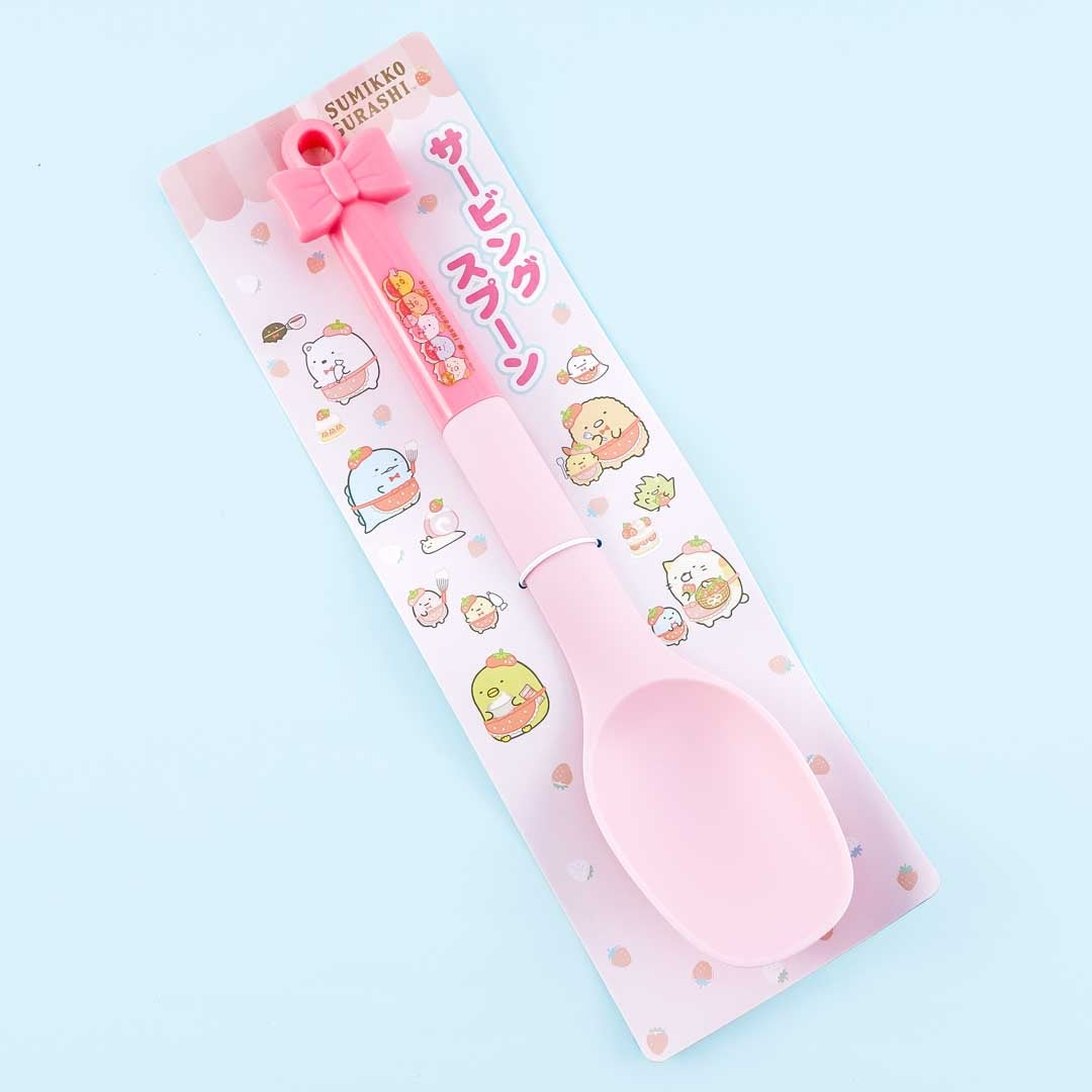 • A super cute serving spoon with prints of the Sumikko Gurashi characters in strawberry costumes on the handle