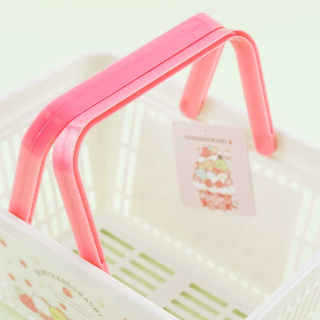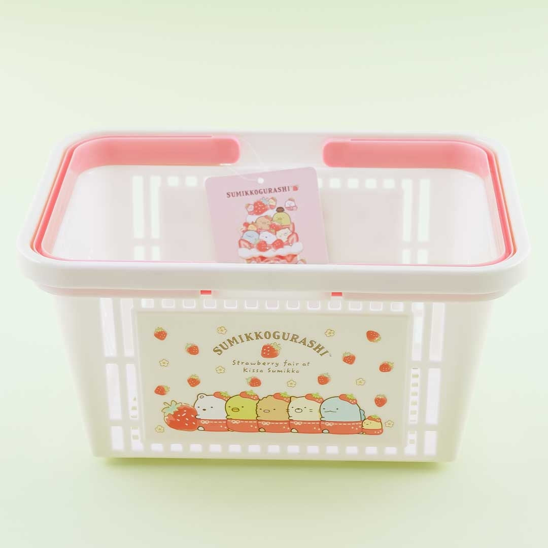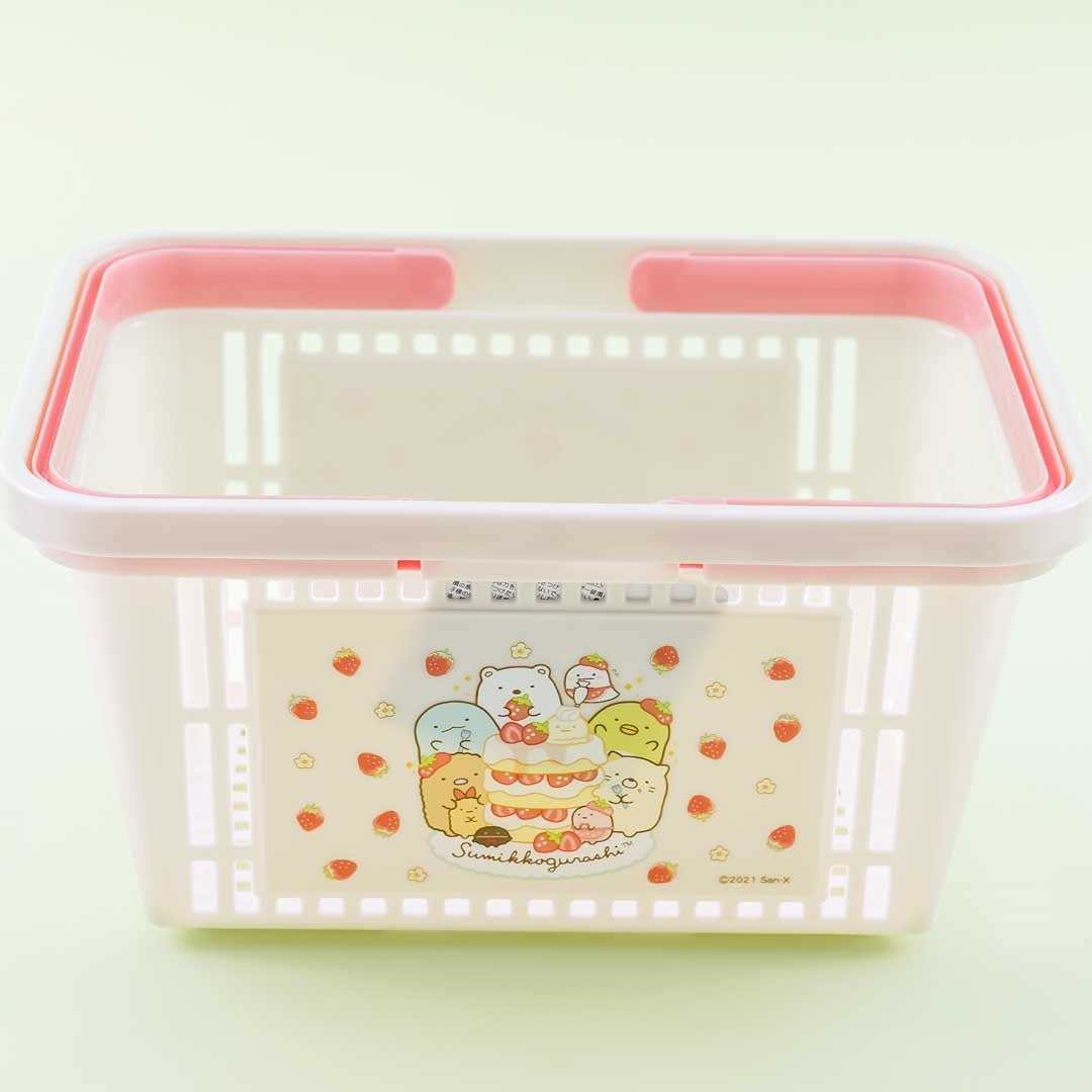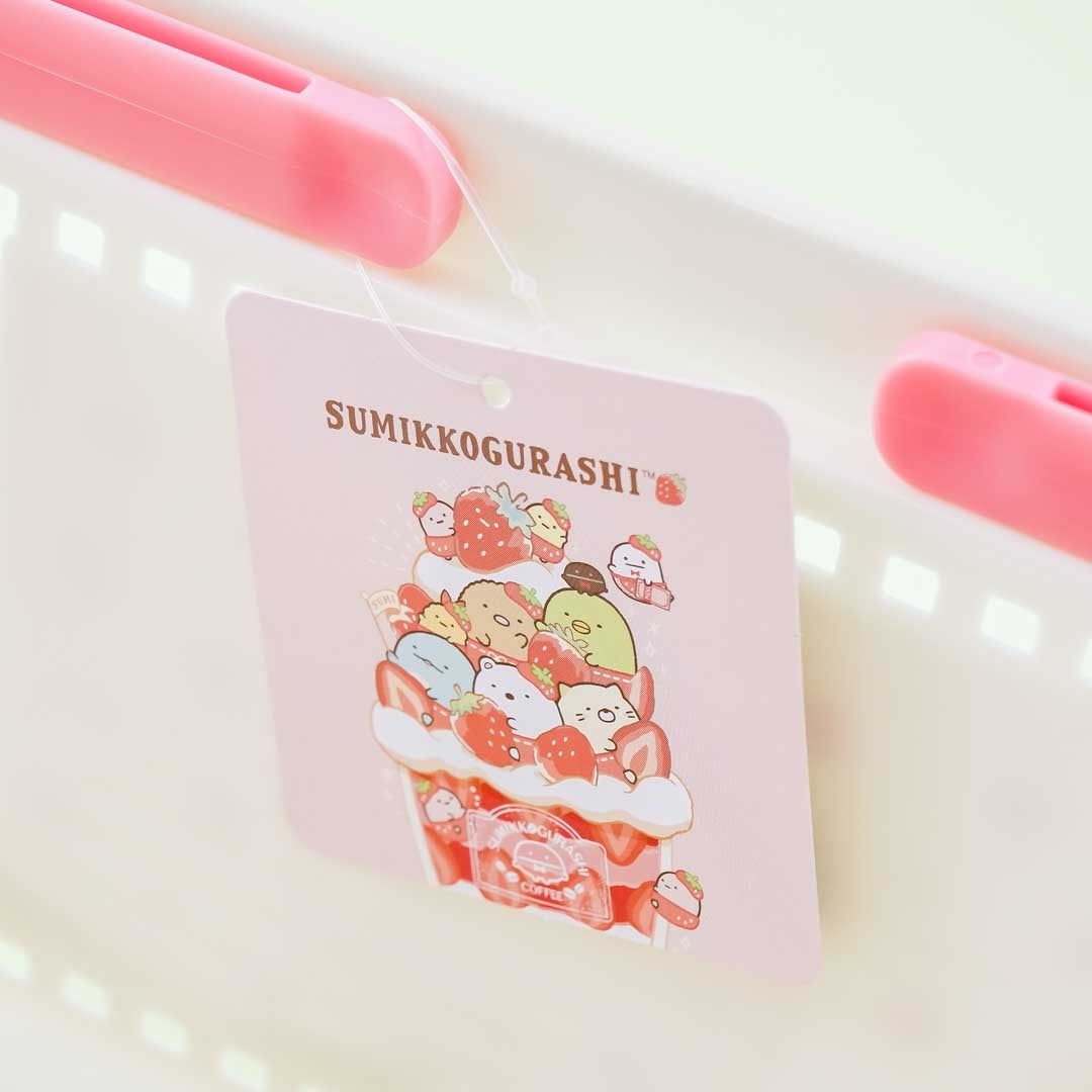 • A kawai mini basket featuring prints of the Sumikko Gurashi eating strawberry shortcake