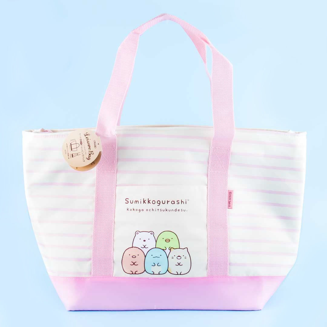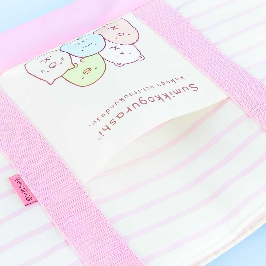 A super cute striped cold storage tote bag featuring the Sumikko Gurashi gang