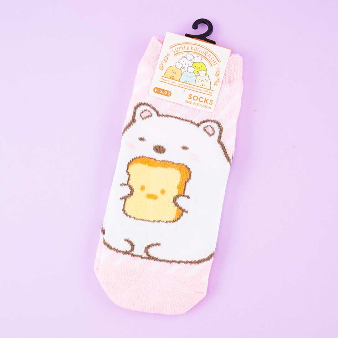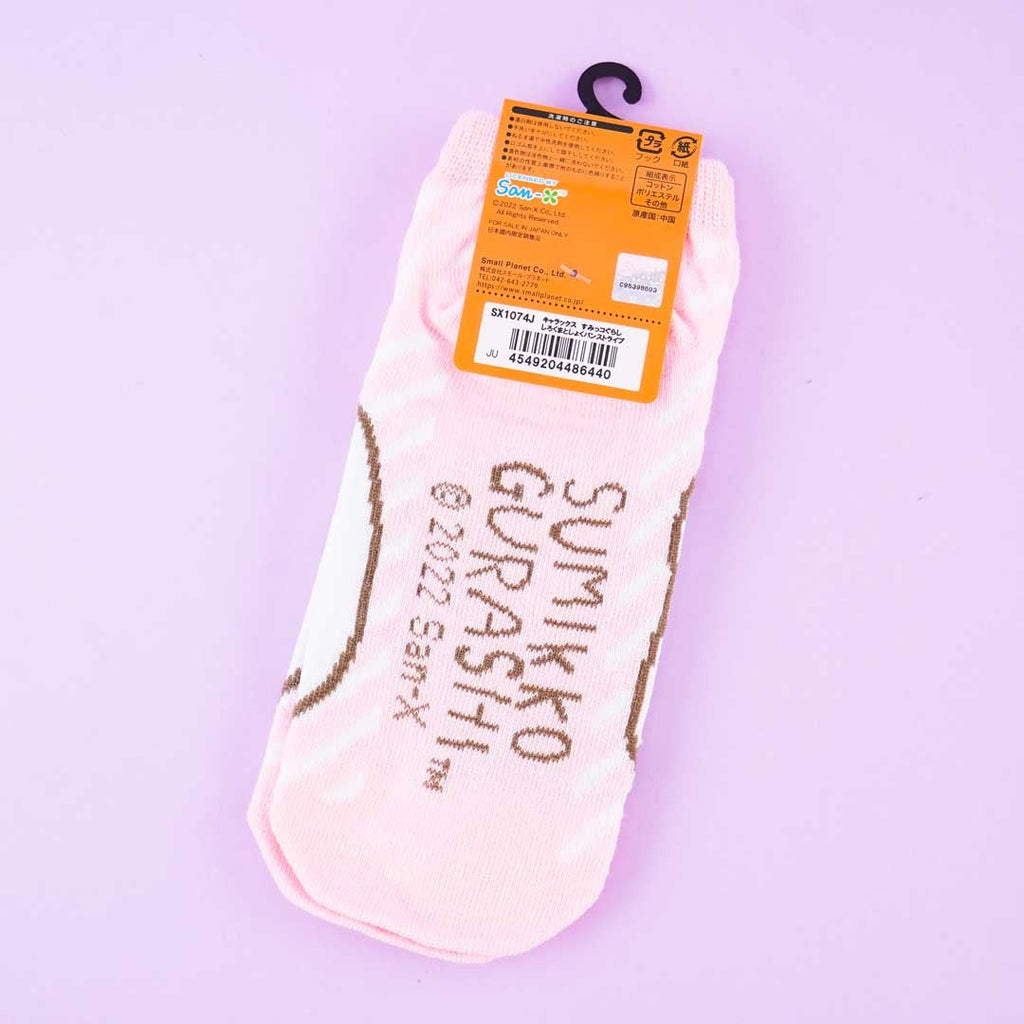 Get ready for bedtime by wearing these super-soft cotton and polyester socks! The cute pair features stripes and illustrations of Shirokuma holding Shokupan from Sumikko Gurashi.