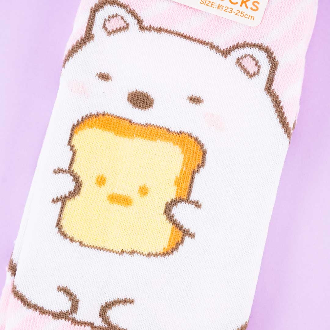 A pair of kawaii Sumikko Gurashi striped socks with prints of Shirokuma and Shokupan