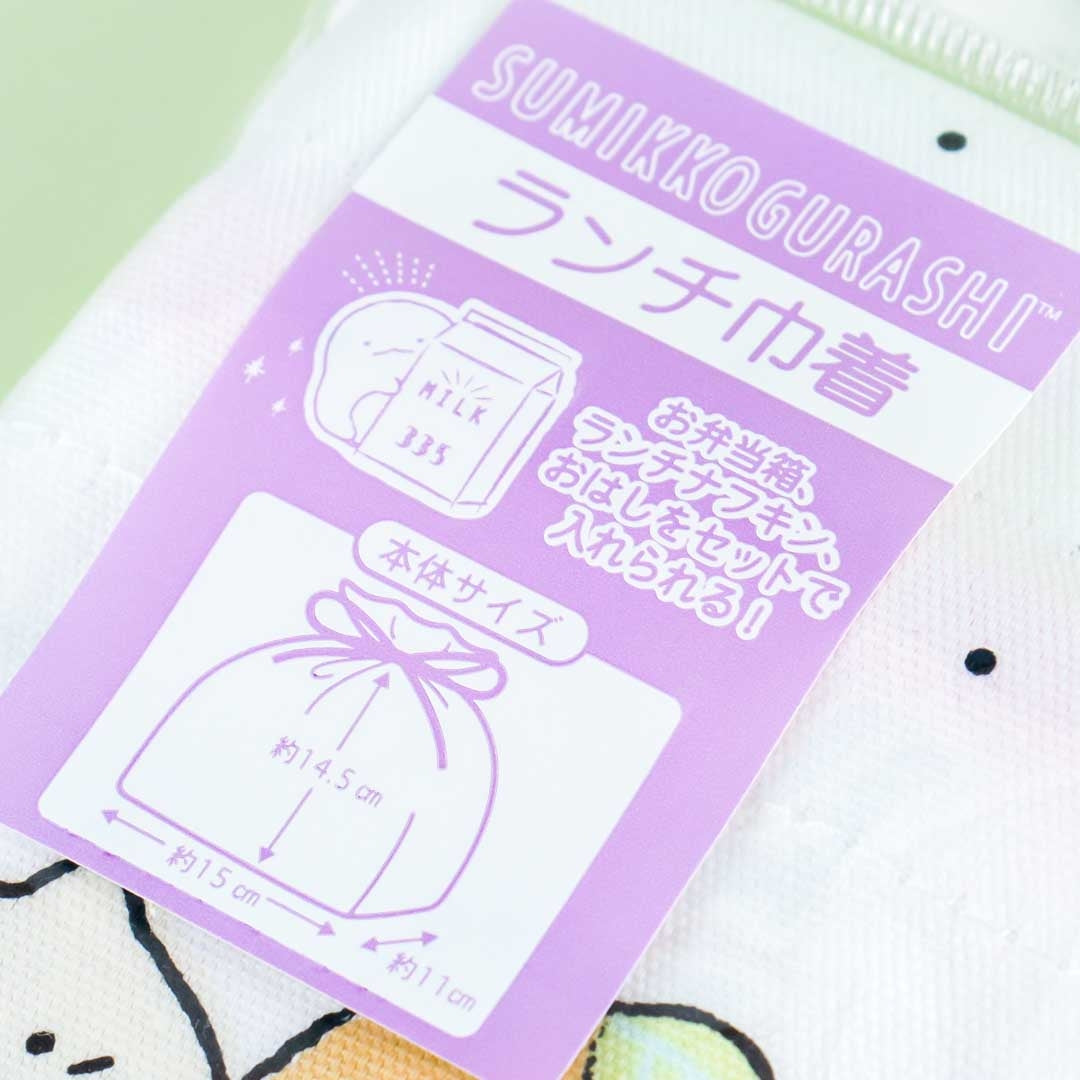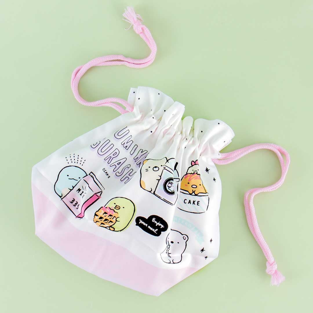 This super cute bag features kawaii illustrations of Sumikko Gurashi characters on top of shakes! Use this pouch as a bento box storage and secure the contents by pulling the strings.