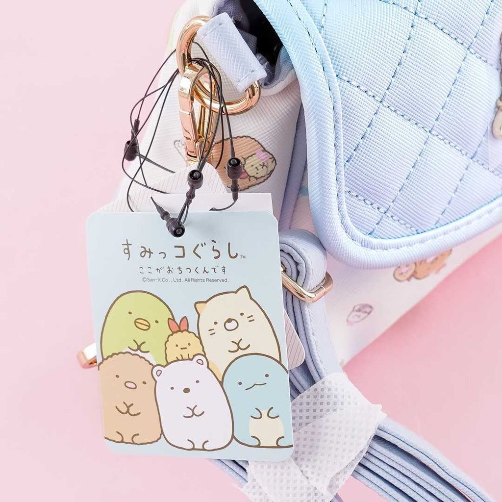 • A cute sling bag with a blue-colored quilted flap and illustrations of the Sumikko Gurashi characters at Tapioca Park