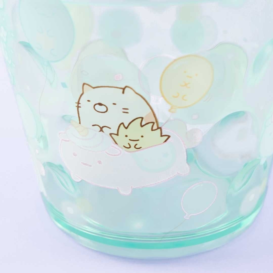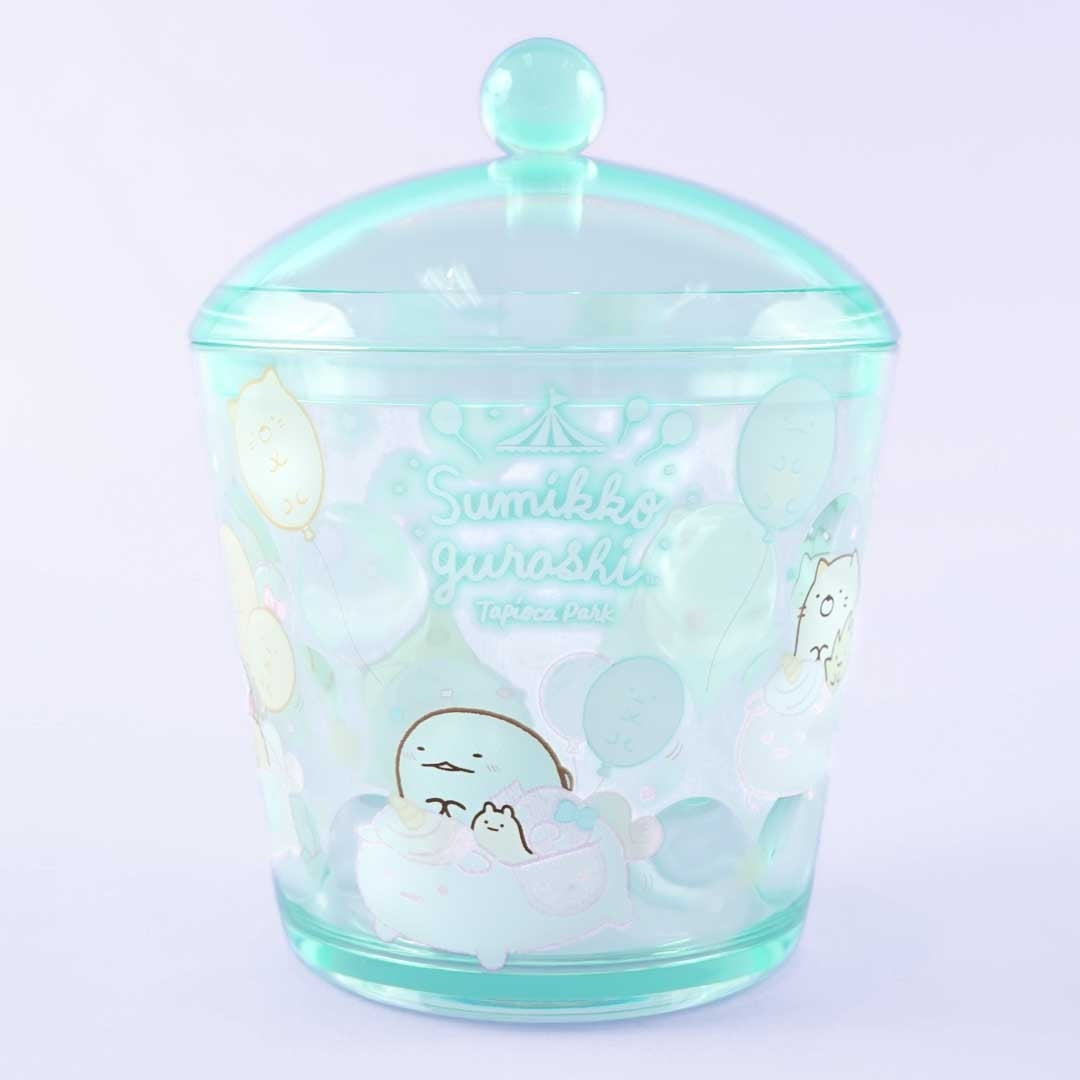 A kawaii transparent canister decorated with an illustration of the Sumikko Gurashi characters at the Tapioca Park