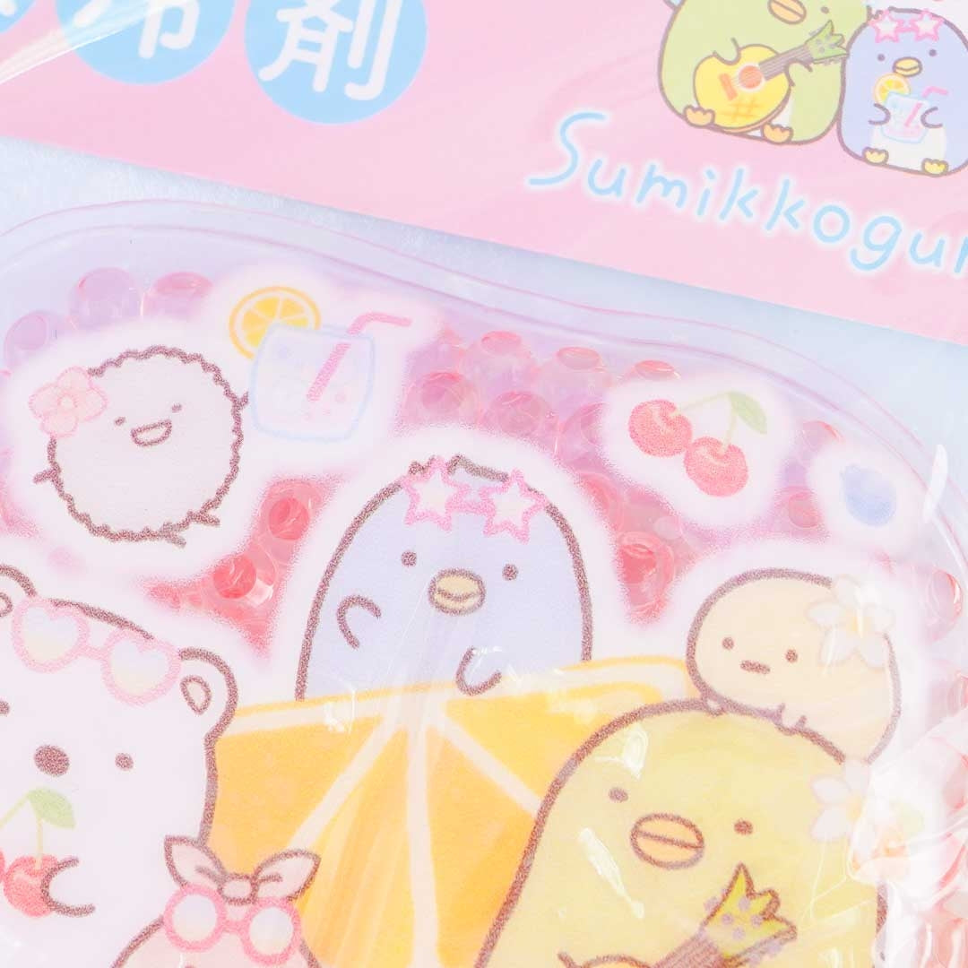A kawaii die-cut cold pad covered in prints of the Sumikko Gurashi having a fruit party for keeping lunch boxes and bottles fresh