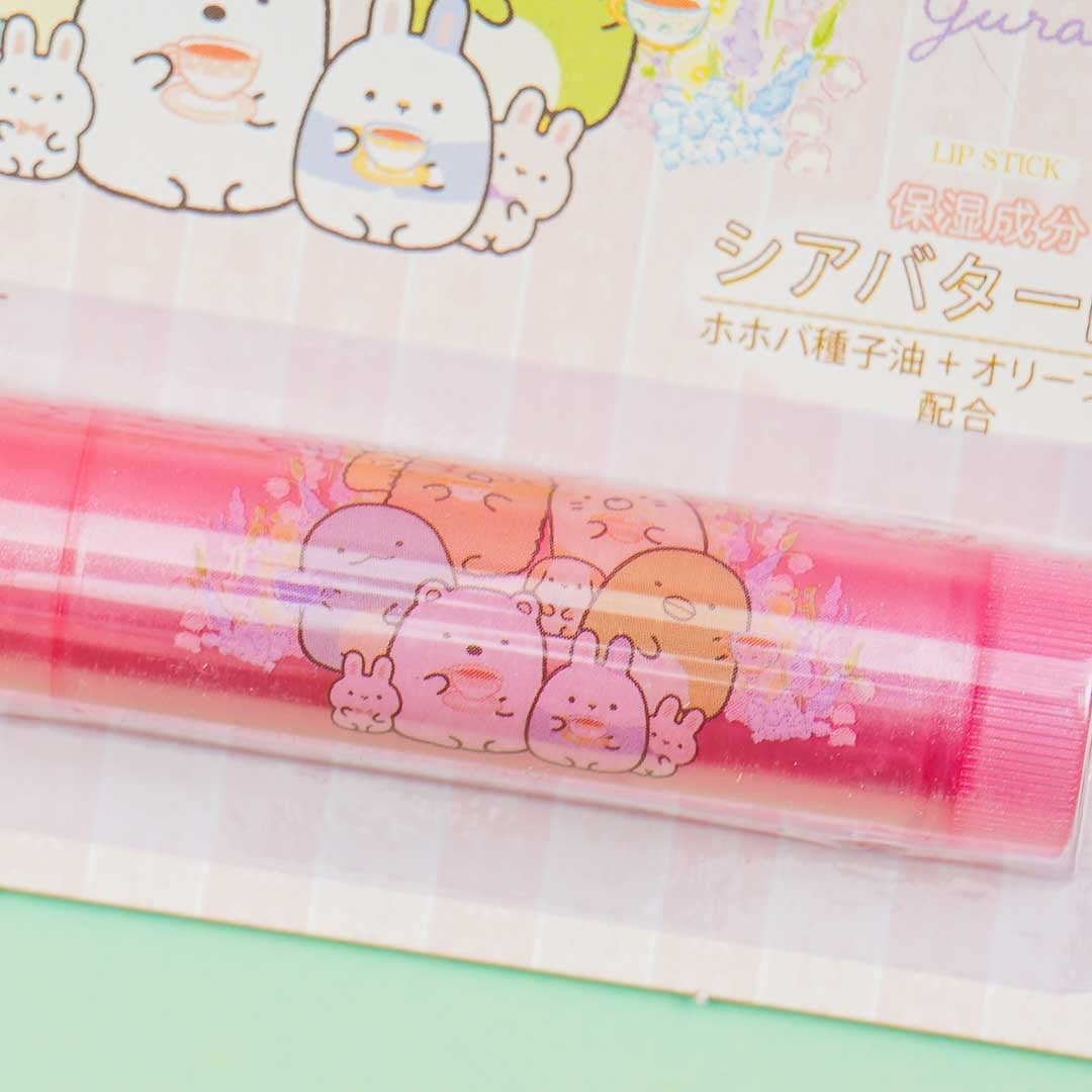 A cute lip balm illustrated with the Sumikko Gurashi having tea