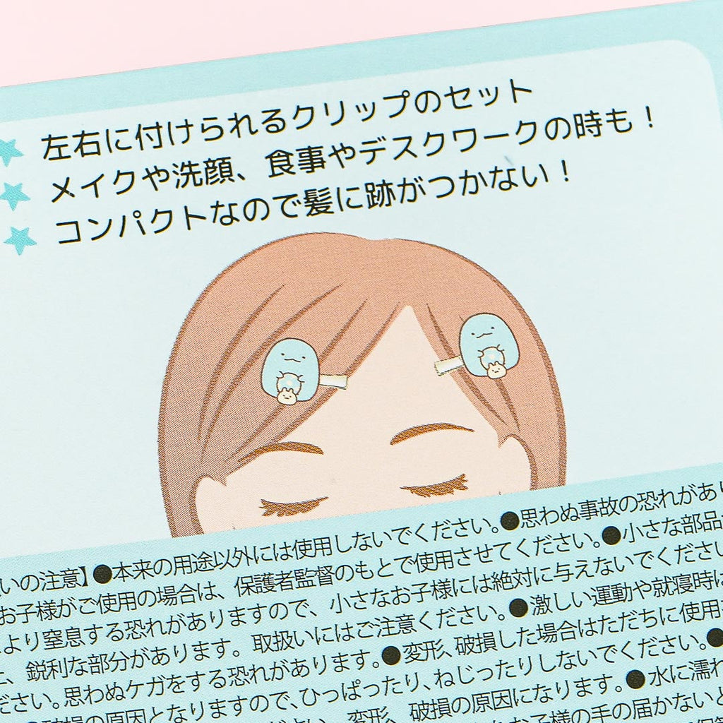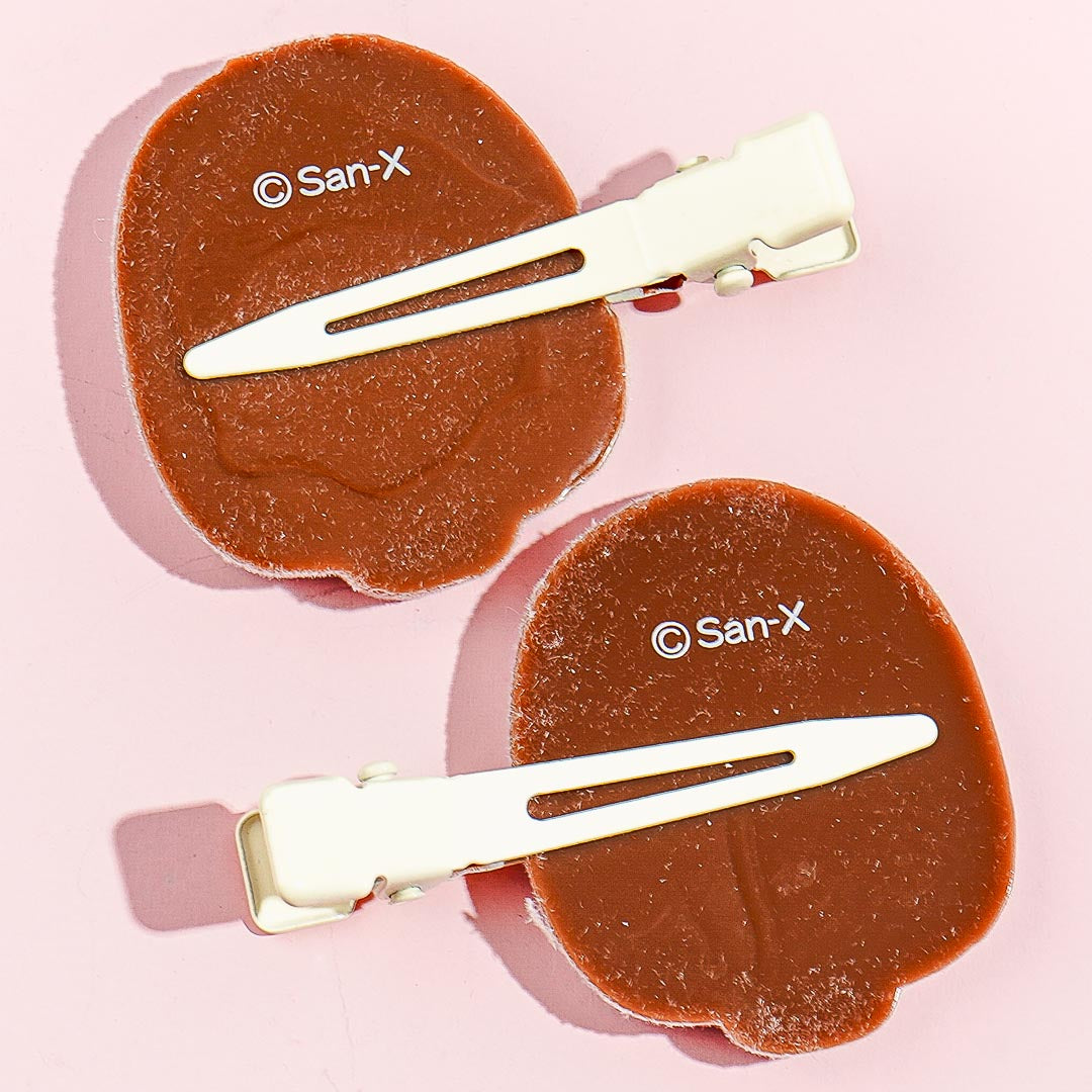 Keep your bangs off your face by wearing this super cute pair of hair clips! Each clip has a velvety charm featuring Tokage and Nisetsumuri from Sumikko Gurashi.