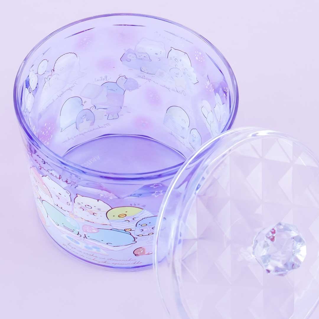 A clear round jewelry case featuring Sumikko Gurashi characters in the wintertime