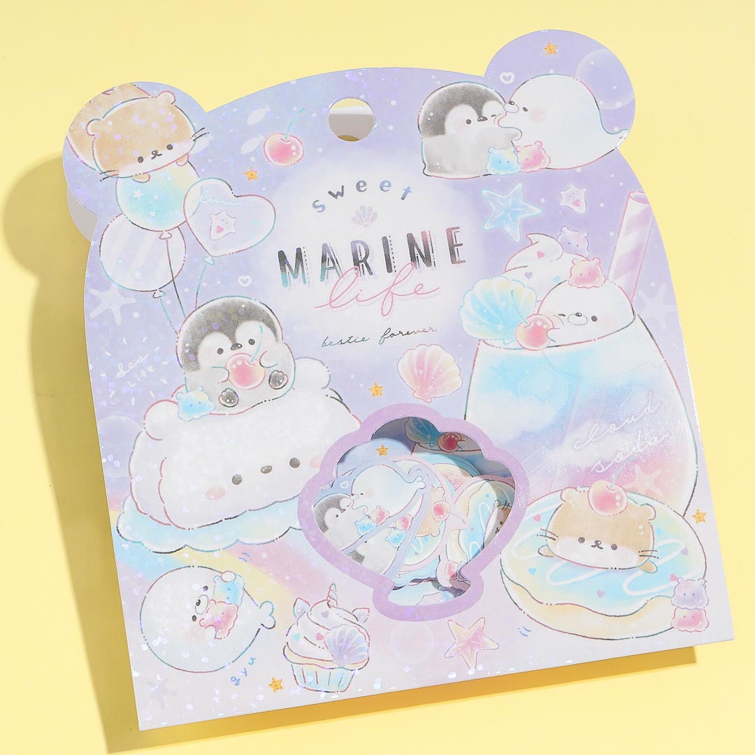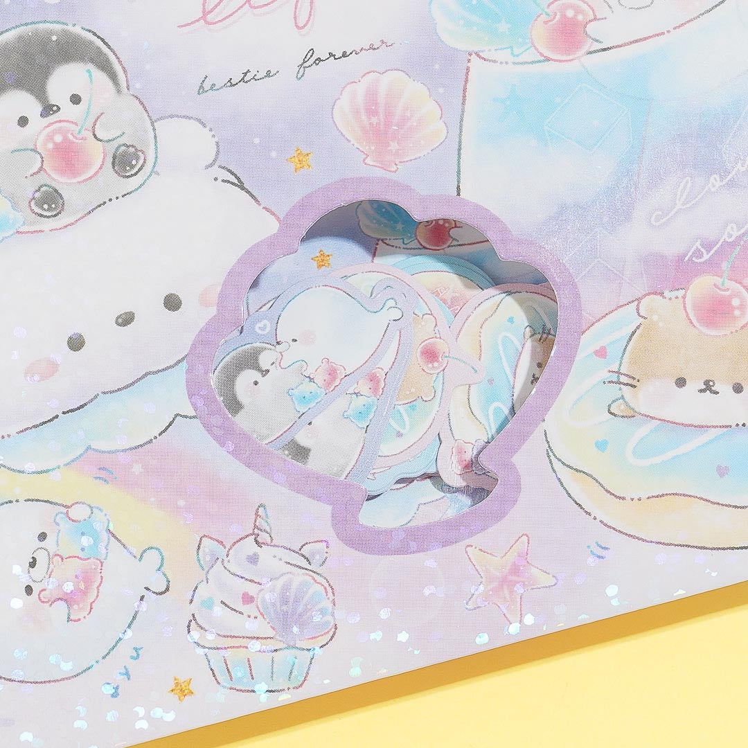 Add some cute pizzazz to your laptop case, notebooks, journals, and other things by decorating them with these fun die-cut stickers! This pack of stickers showcases cute marine animals playing around with giant desserts. It's the perfect addition to your kawaii stationery kit.