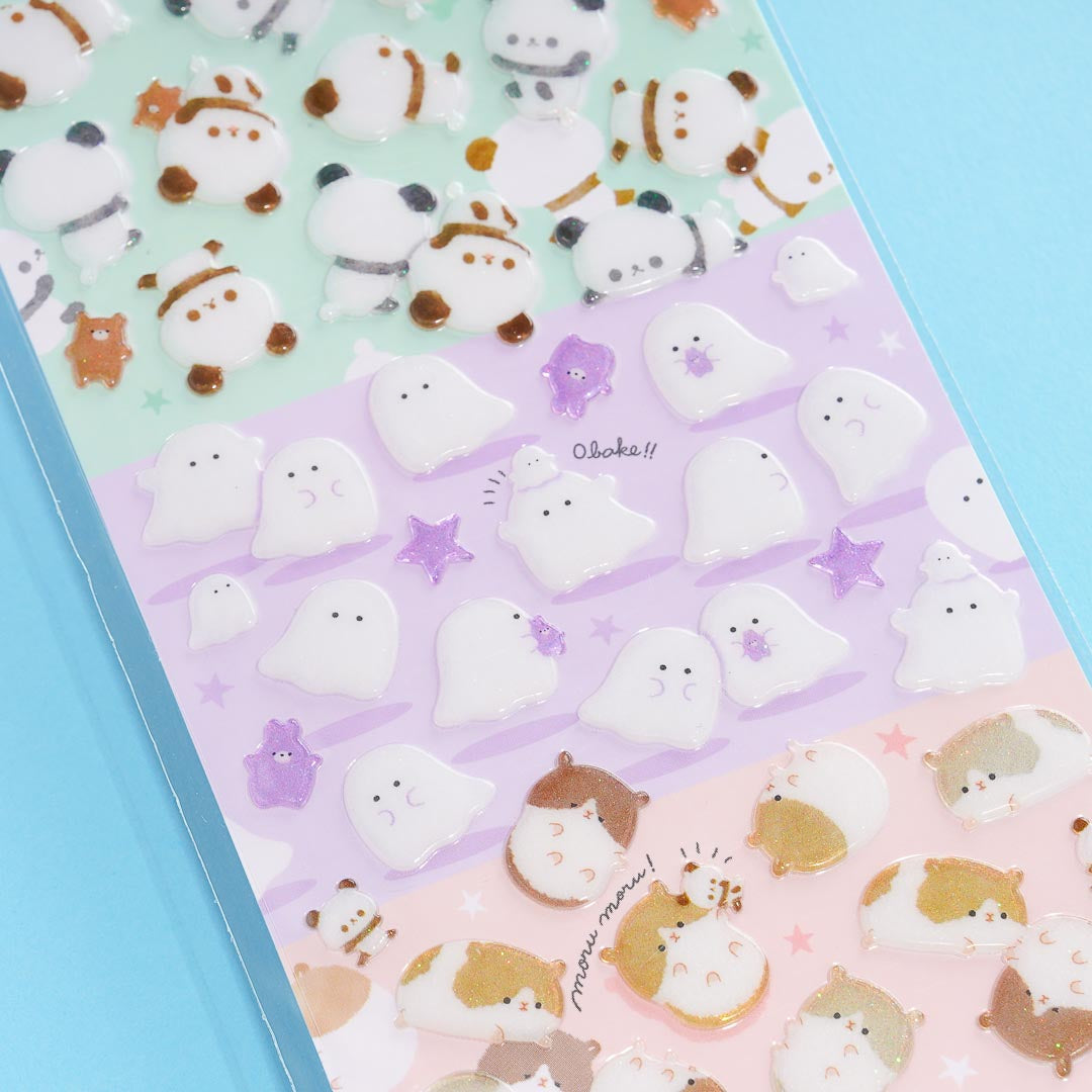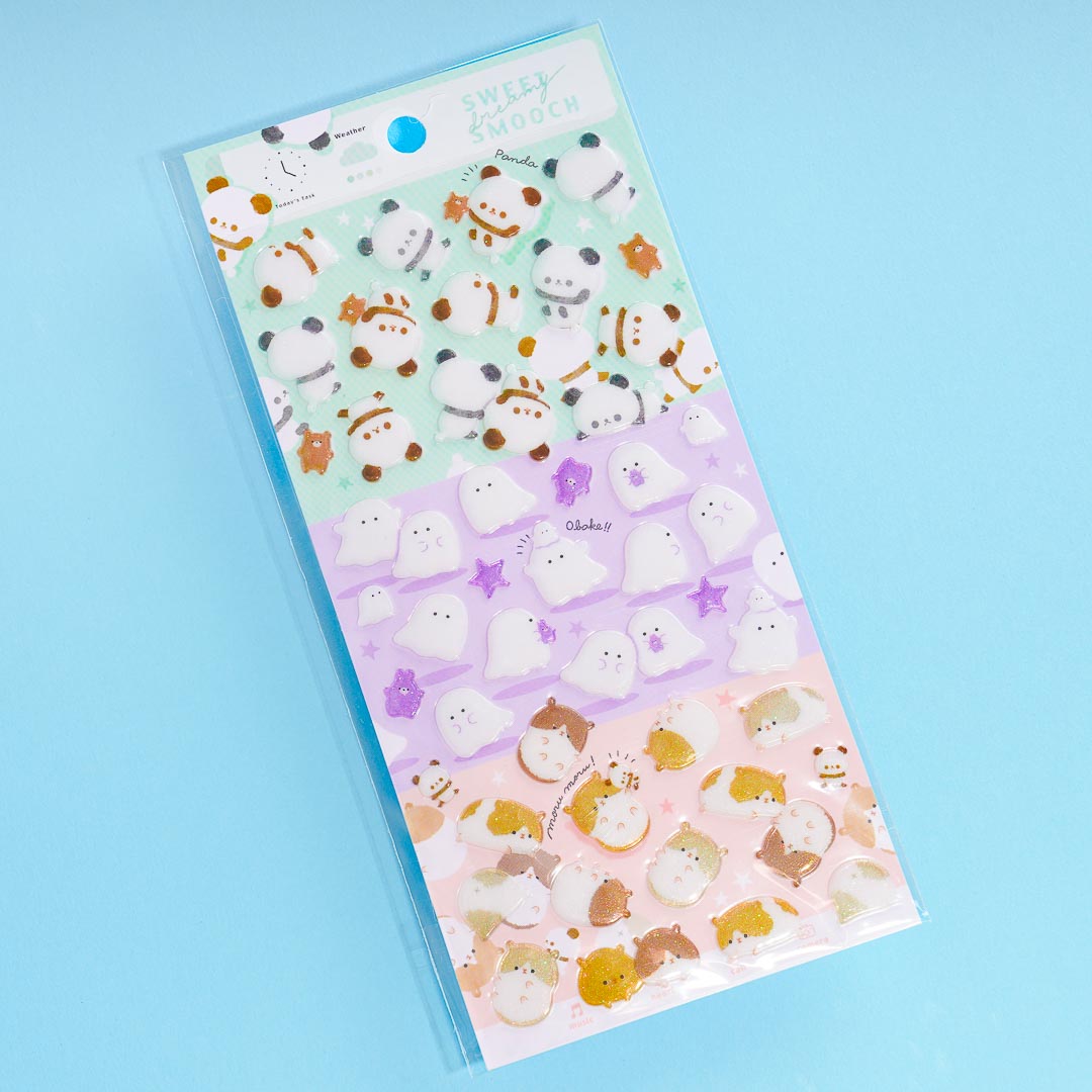 Have a blast decorating your notebook covers with these kawaii stickers! The set features prints of cute pandas, ghosts, and hamsters! Each die-cut piece also has glitters on it.