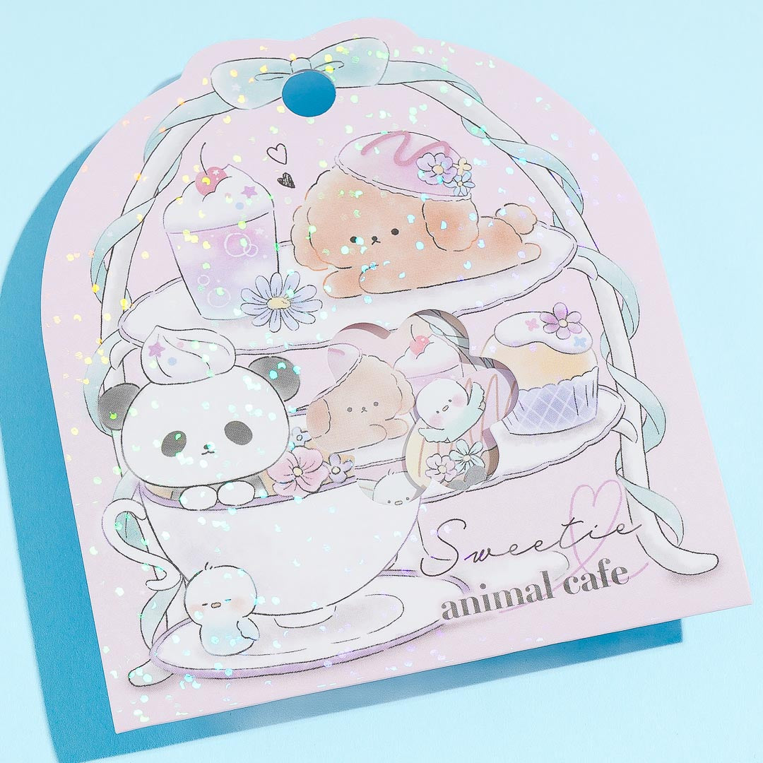 Decorate your notebook covers with this glittery pack of mini sticker flakes. It showcases kawaii baby animals playing with cafe treats! Add these stickers to your stationery collection.