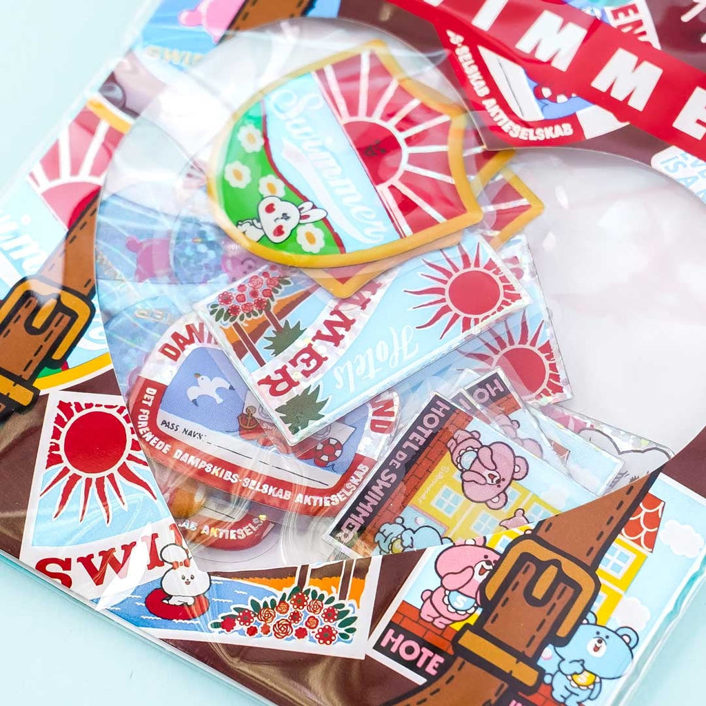 • A pack of cute puffy stickers with illustrations of bears and bunnies traveling to various places