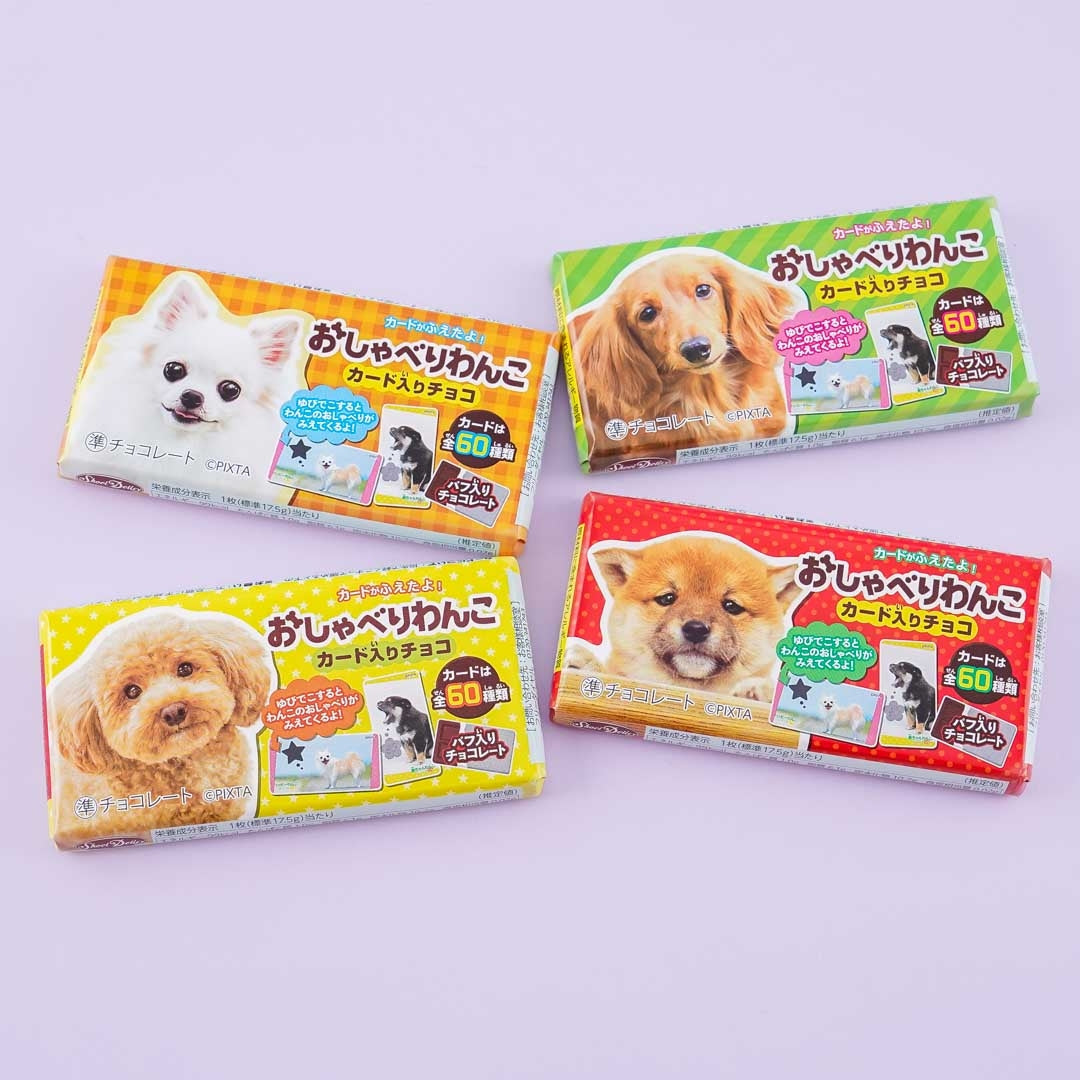 Indulge in this crunch chocolate bar with a wrapper that features a talking wanko or dog! It also comes with a free dog photo card with a game on it! You’ll receive a random packaging style out of four available designs — as well as a random dog card out of sixty possible designs!