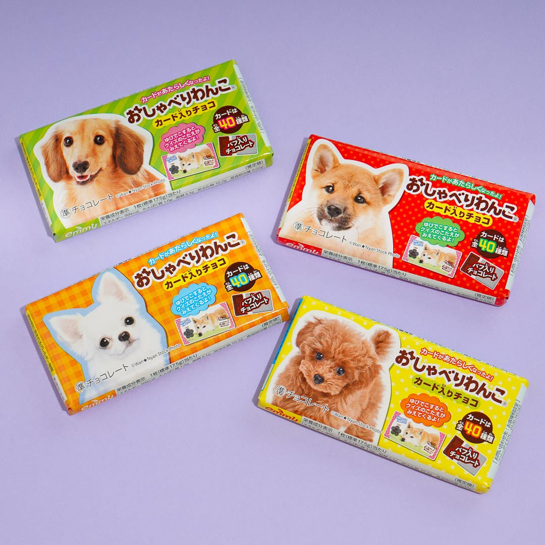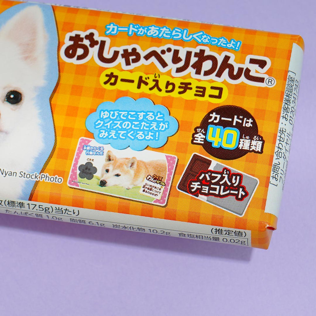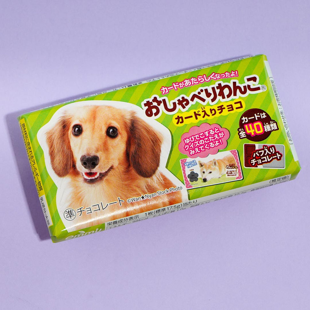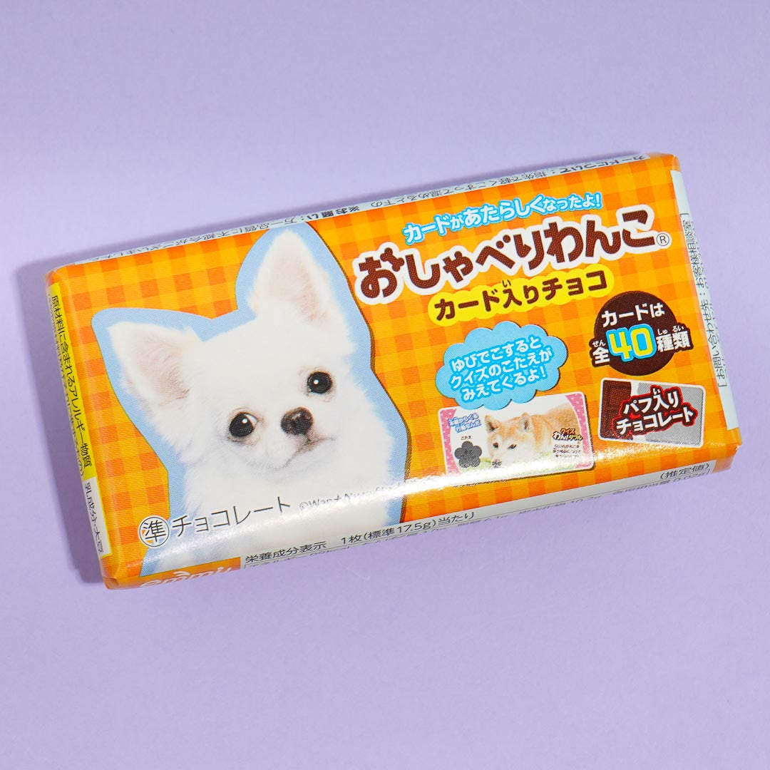 Have fun while you enjoy the sweet and crunchy taste of this chocolate bar! The bar features a talking wanko or dog and comes with a card. Collect all 40 possible card designs. When you turn the card, there's also a quiz you can answer!