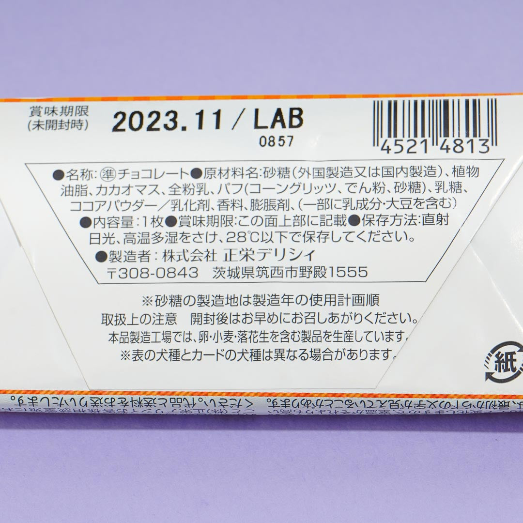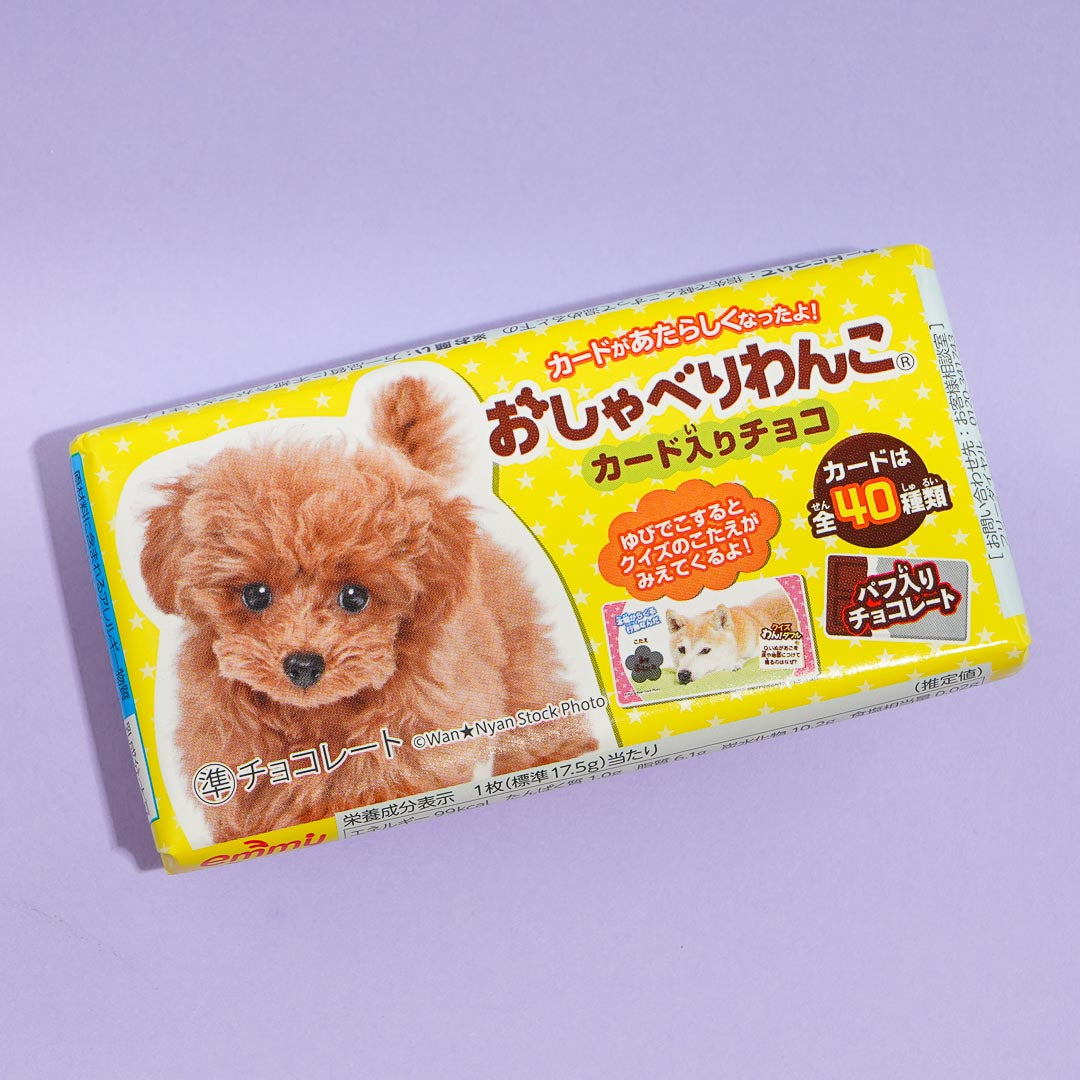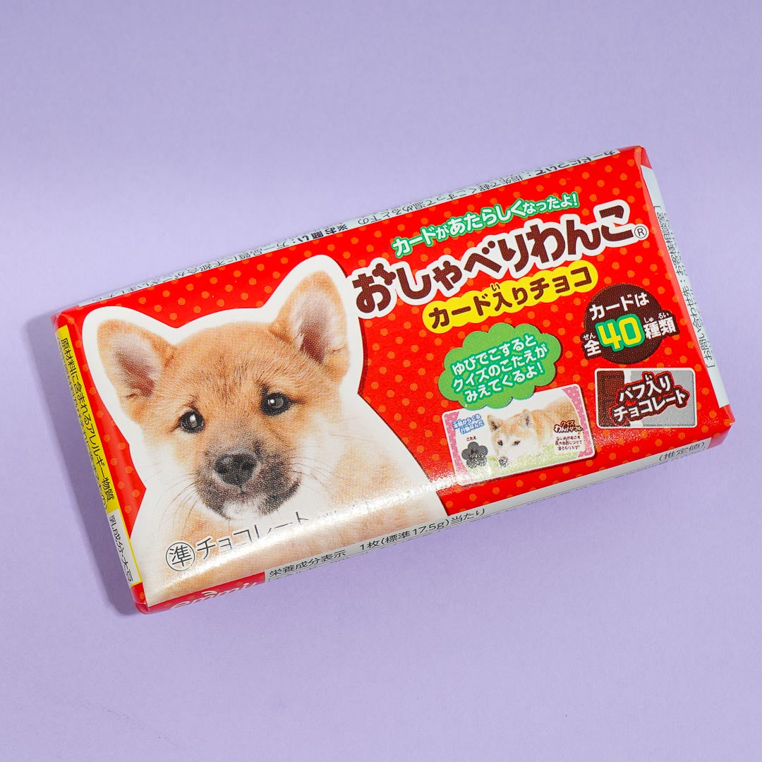 Have fun while you enjoy the sweet and crunchy taste of this chocolate bar! The bar features a talking wanko or dog and comes with a card. Collect all 40 possible card designs. When you turn the card, there's also a quiz you can answer!