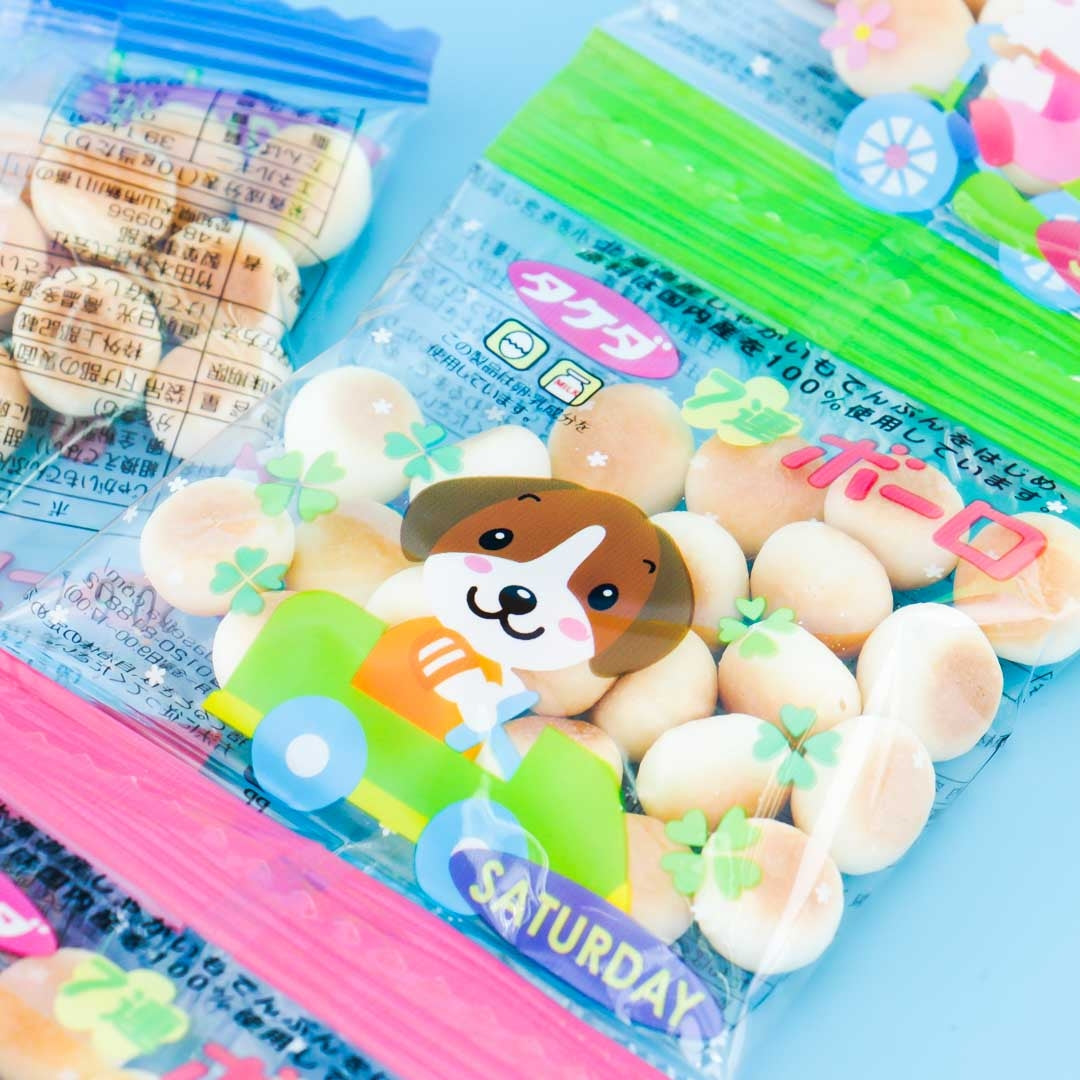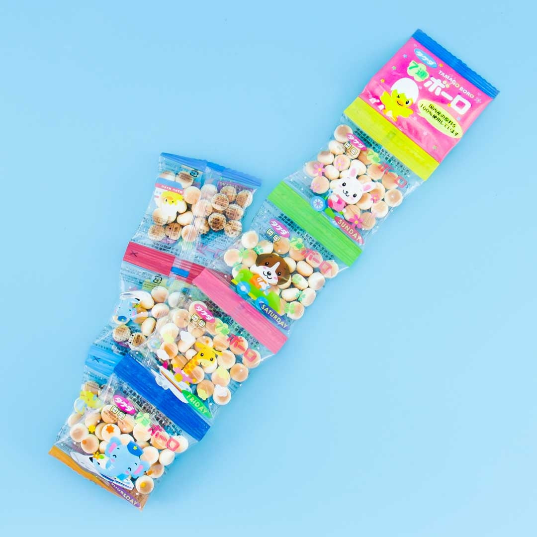 Tamago Boro egg biscuits are very popular snacks among kids in Japan! They melt inside your mouth without biting, so it's easy and safe even for little kids to eat. These biscuits come in a cute set which has 7 sachets - one for each weekday! So cute!