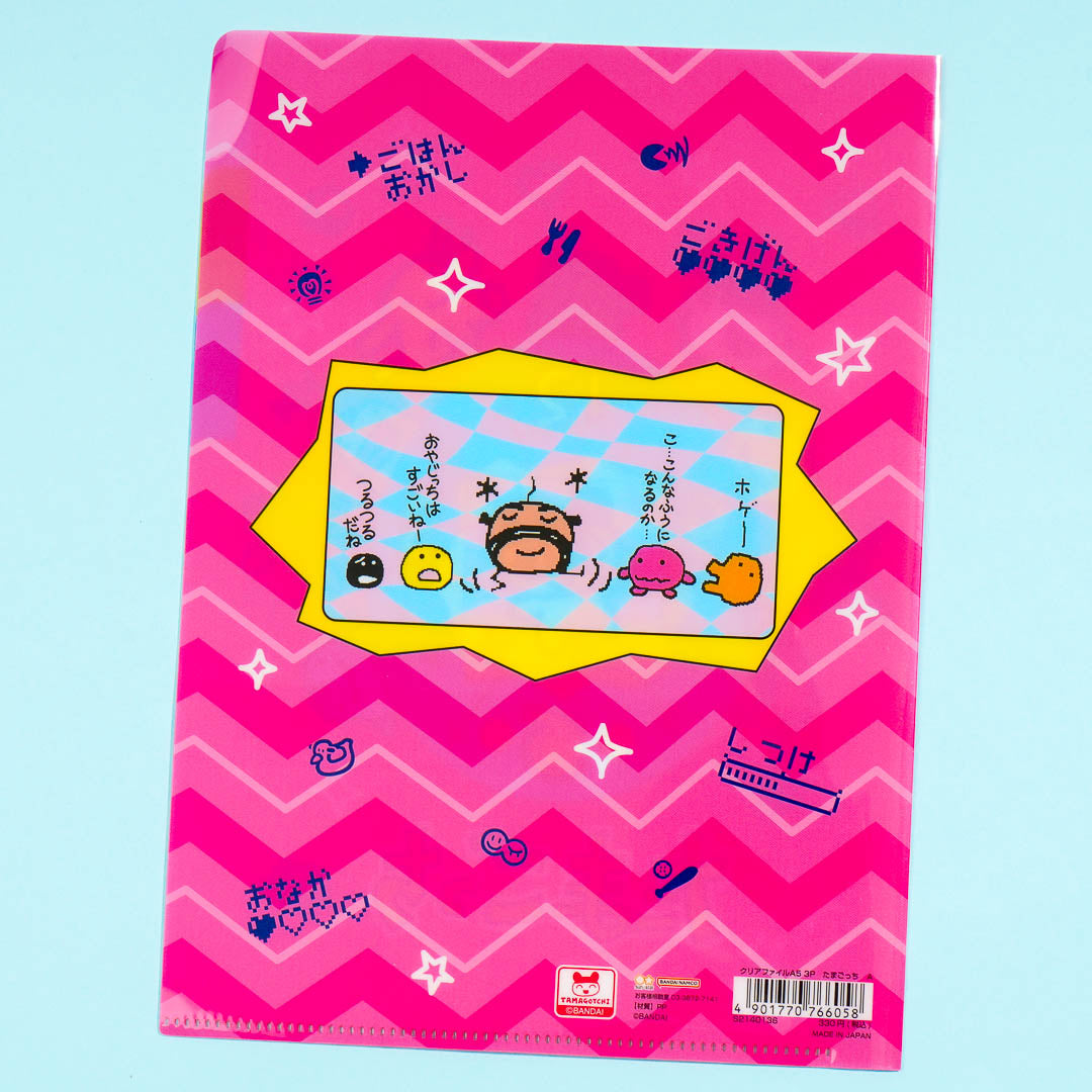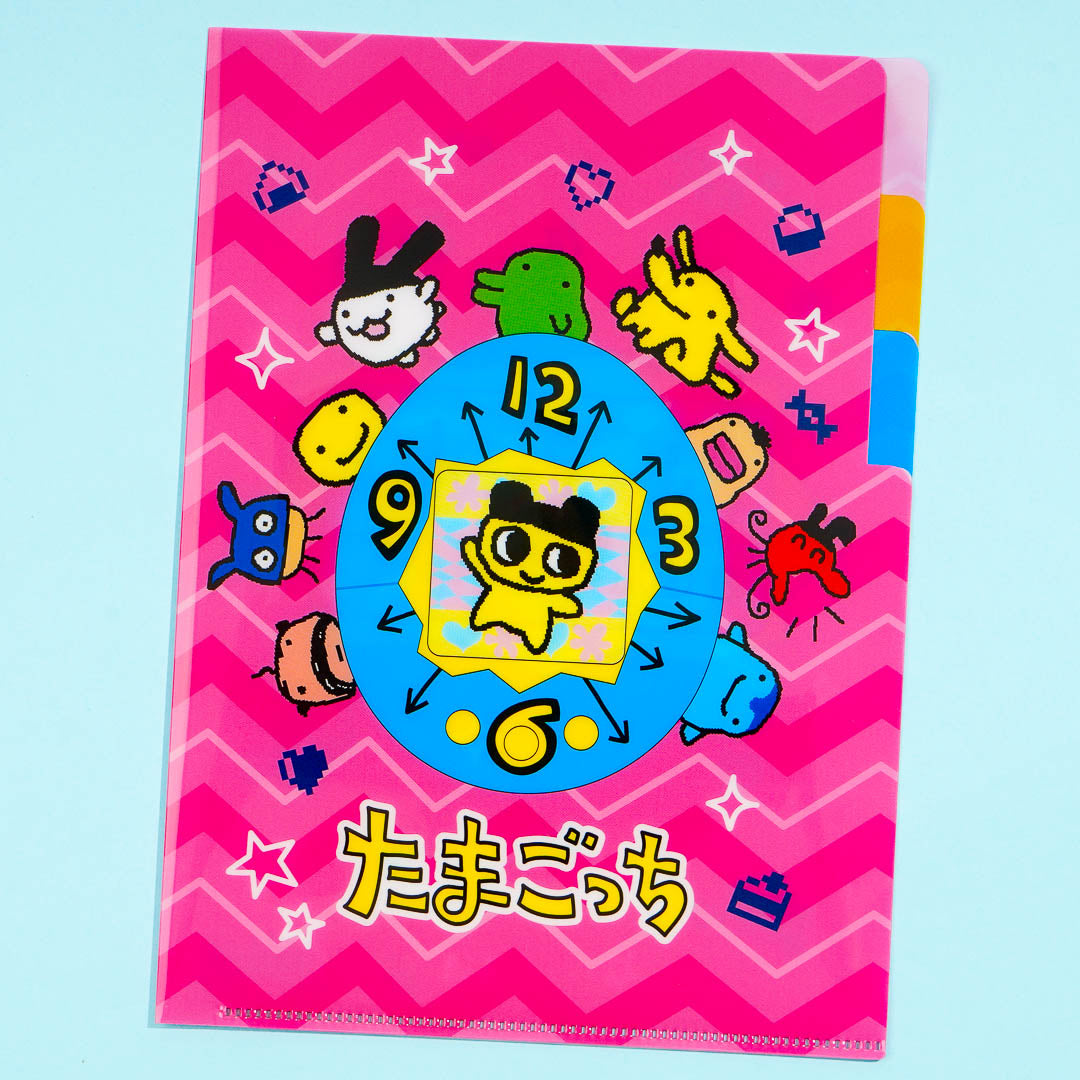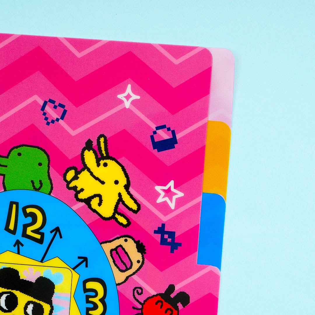 This cute clear A5 file folder features prints of Tamagotchi characters surrounding a clock. Use it to organize your documents! It has three pockets with indexes that make sorting your papers easy-peasy.