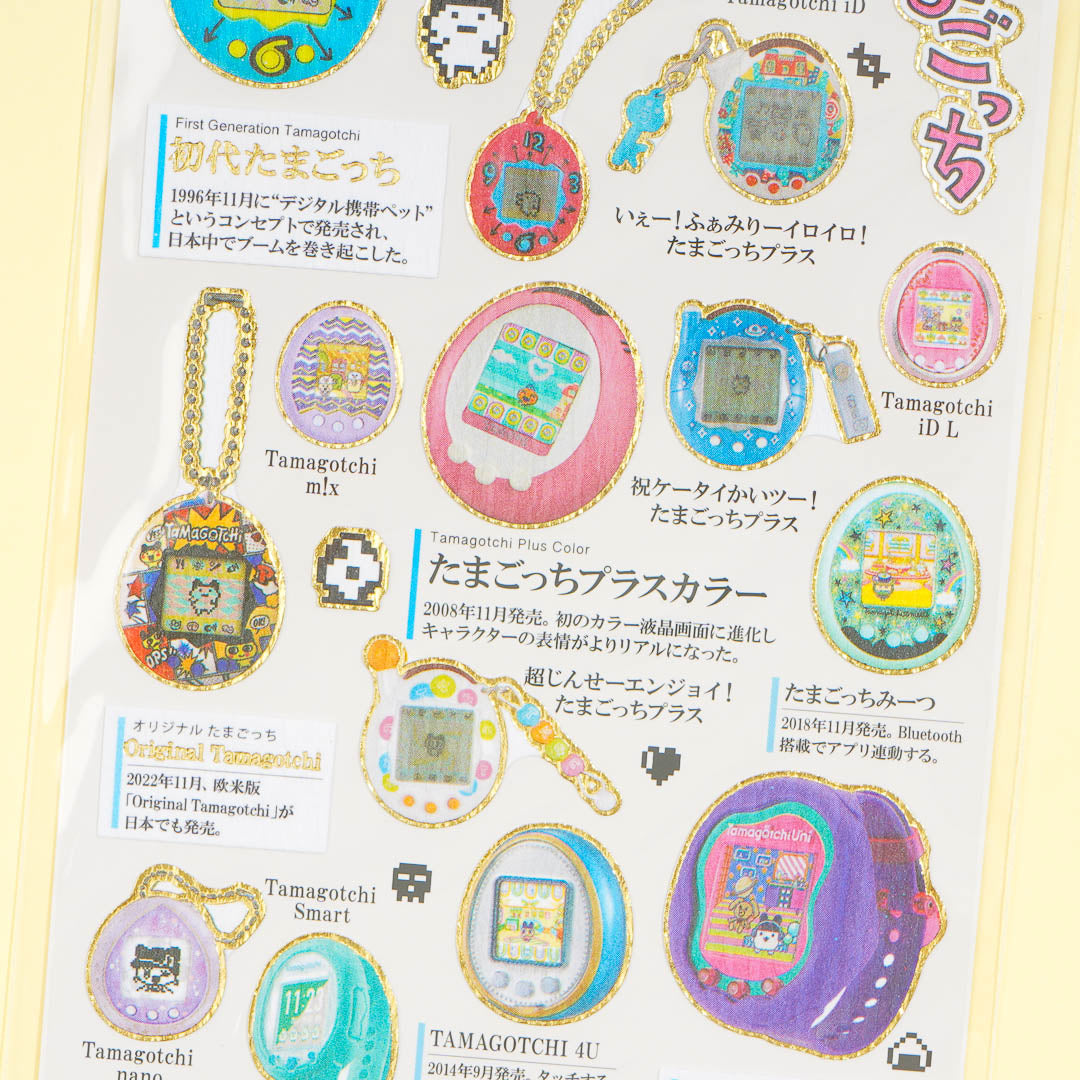 Have fun decorating your scrapbooks using these die-cut stickers! The sheet features illustrations of the different Tamagotchi game models throughout the years! Each piece also has gold foil detailing. You can also add these seals to your growing sticker collection.