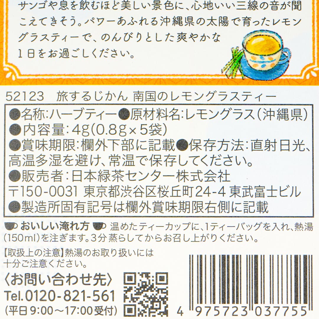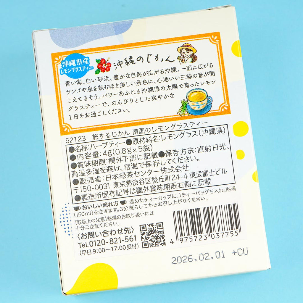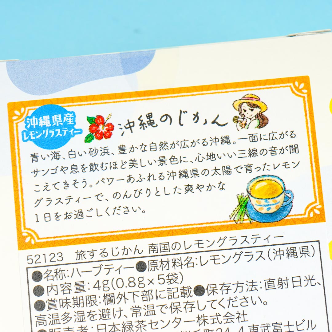 Spend a relaxing day while drinking lemongrass tea. The refreshing flavor and packaging of this Travel Time tea will remind you of the beaches in Okinawa.
