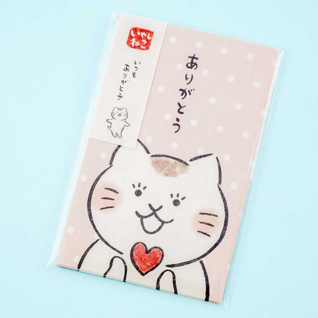 Send special messages to loved ones using this kawaii set of small envelopes. They feature prints of a cat and the text "thank you" written in hiragana. Each envelope is made of Mino Japanese paper.