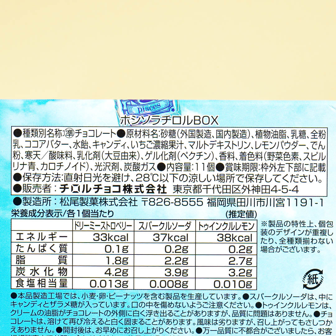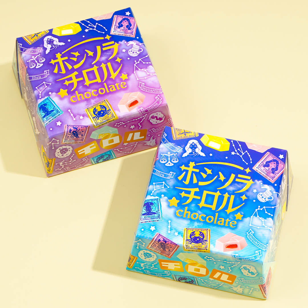 This chocolate treat is perfect for summer festivals! It features three flavors - soda, strawberry soda, and lemon yogurt. The individual packaging has a design that's based on the twelve constellations, and the box looks like "hoshisora" or starry sky!