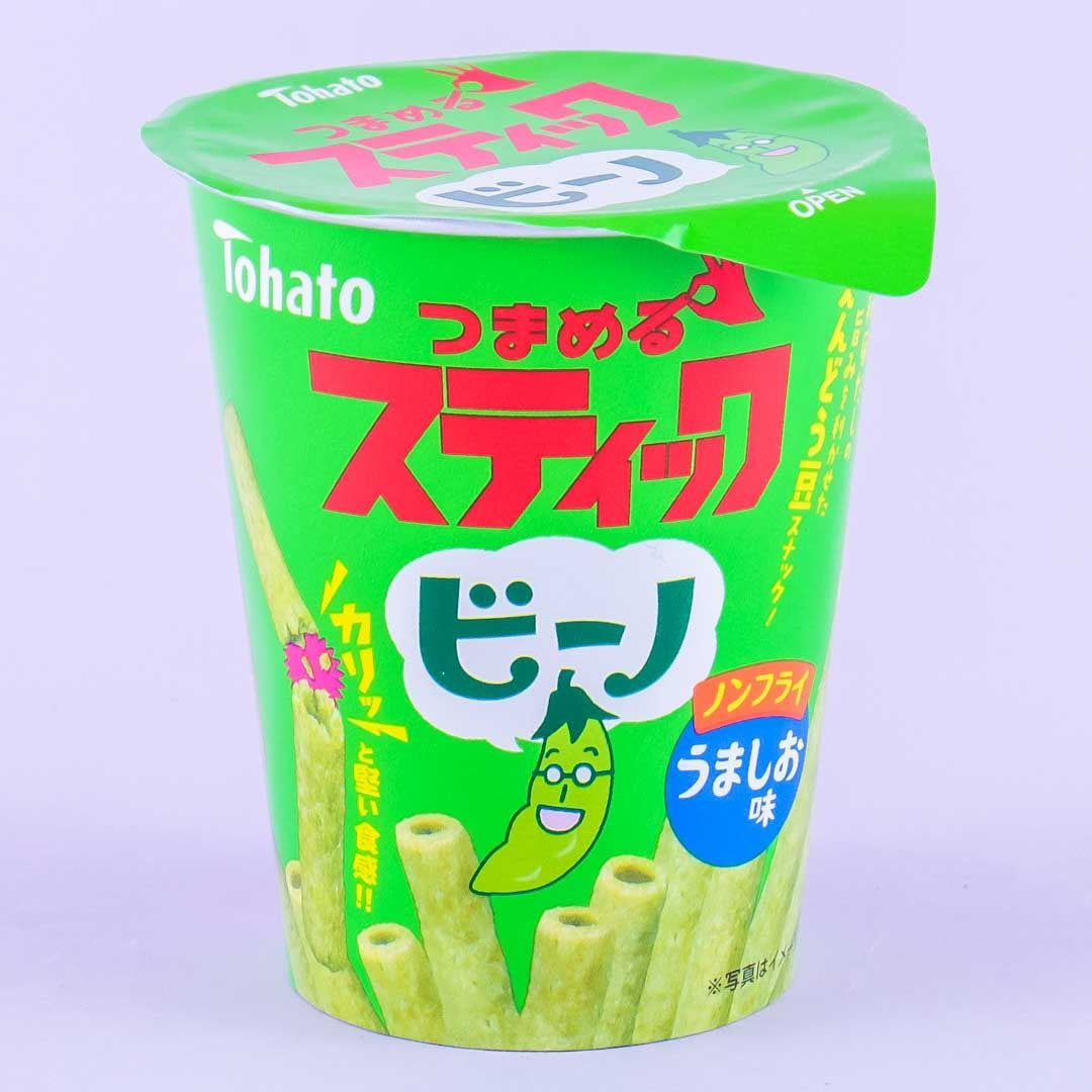 A cup of bonito flakes and kelp-flavored puffed stick snacks made from pod peas