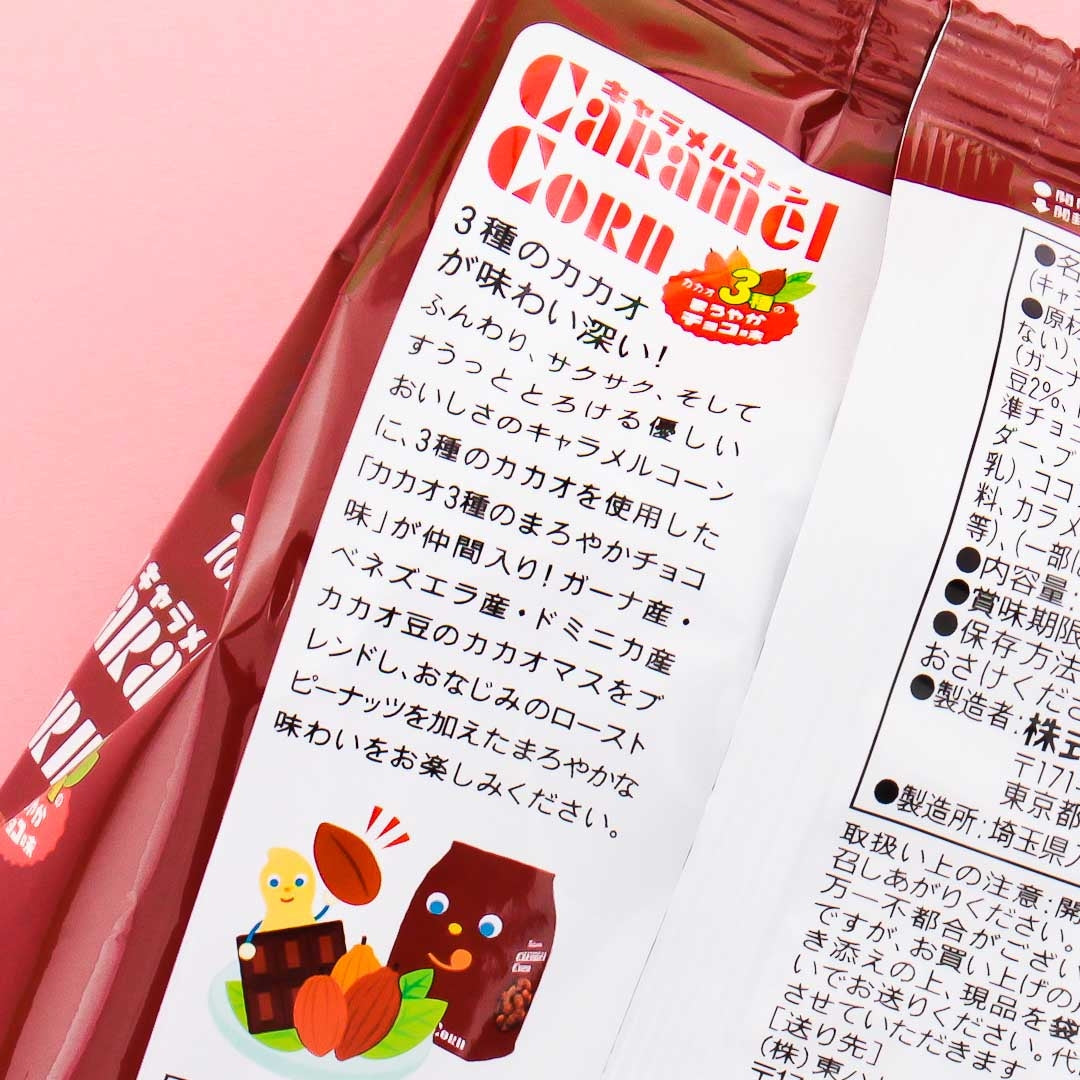 Tohato has been making delicious corn snacks since 1971 and they always come up with fun & unique flavors! This special pack of caramel corn snacks is boasting with not one, but THREE different cacao chocolate flavors! The roasted peanuts greatly complement the sweet chocolate taste of this unique corn snack.