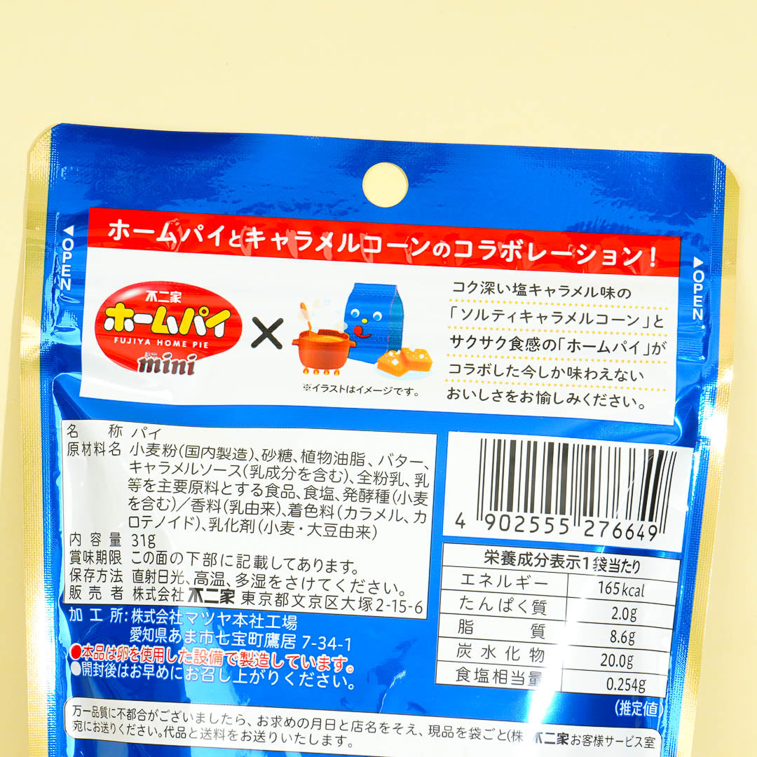 Enjoy this limited-edition snack's delicious combination of rich salted caramel flavor and crunchy pastry texture! It's a special collaboration product between Tohato Salty Caramel Corn and Fujiya Home Pie. The resealable pouch makes this pack of mini Home Pie treats perfect for snacking on the go!