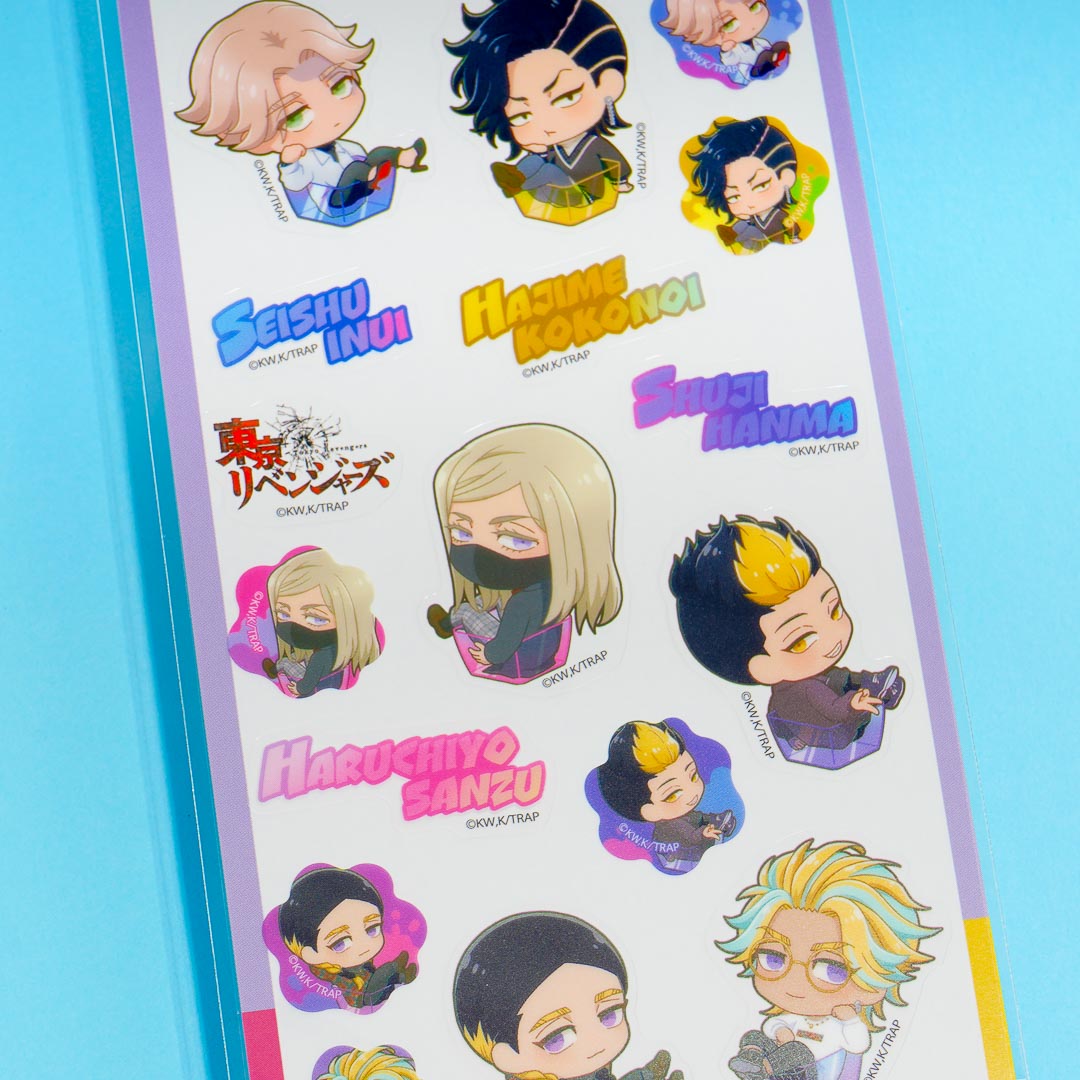 This purple sticker sheet features prints and names of Seishu Inui, Hajime Kokonoi, and other characters from the famous animated series, “Tokyo Revengers.” Use these die-cut seals to jazz up your photo albums!
