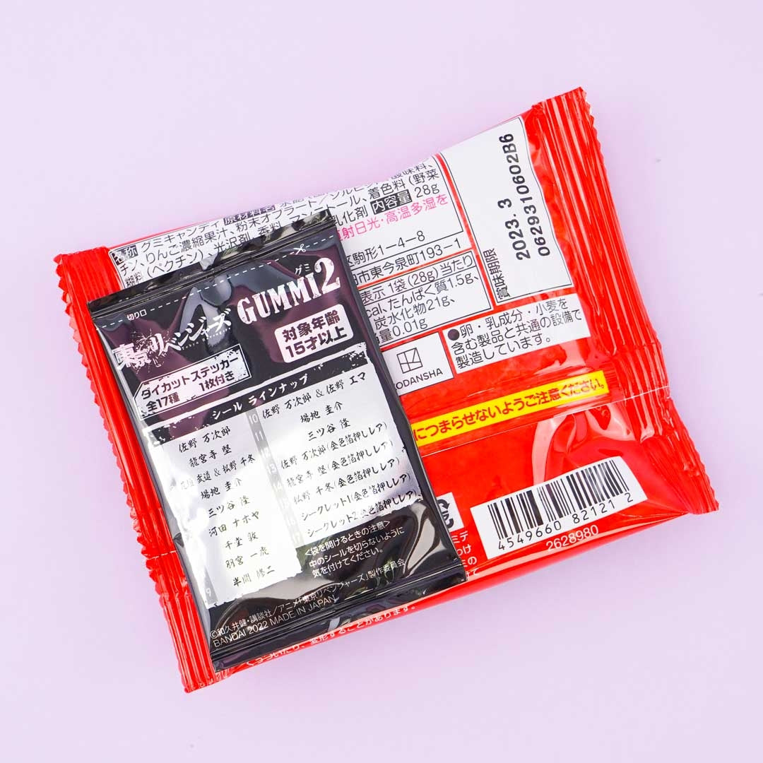 A pack of clover-shaped green apple-flavored gummies illustrated with characters from Tokyo Revengers
