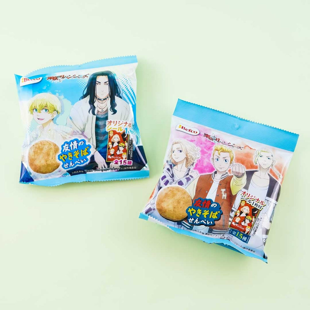 A pack of yakisoba-flavored rice crackers featuring prints of Tokyo Revengers characters