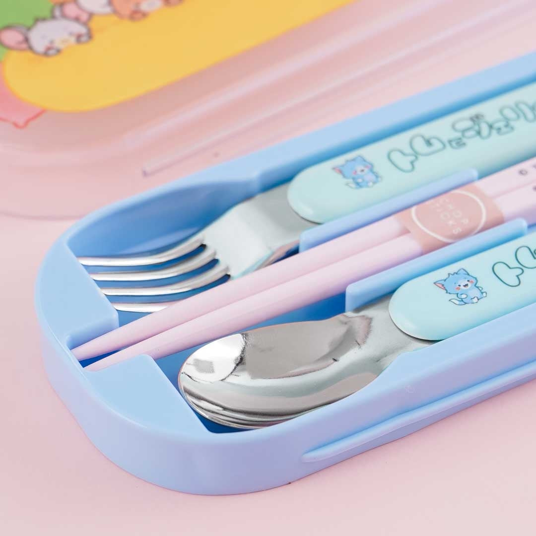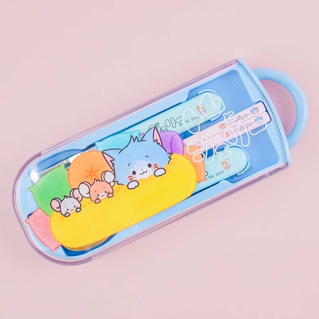 Add this super cute utensil set to your lunch box! This kit including the spoon, chopsticks, sliding lid, and the case all have illustrations of the manga version of the iconic “Tom And Jerry” cartoons — with the characters getting ready to sleep. With silver ion properties that eliminate bacteria, this handy utensil kit is safe to use and is dishwasher compatible. Highly recommended for children's use!