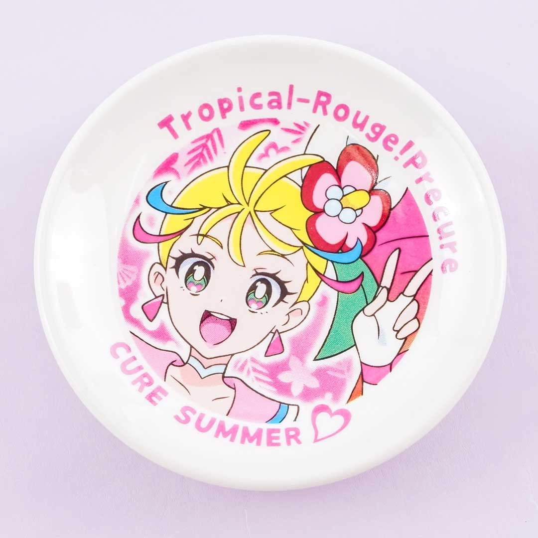 This kawaii mini soy sauce plate is covered in a print of Cure Summer from the anime Tropical-Rouge! Pretty Cure. Use this small porcelain plate to serve condiments during mealtime! You can use it to heat things in the microwave and you can clean it in the dishwasher.