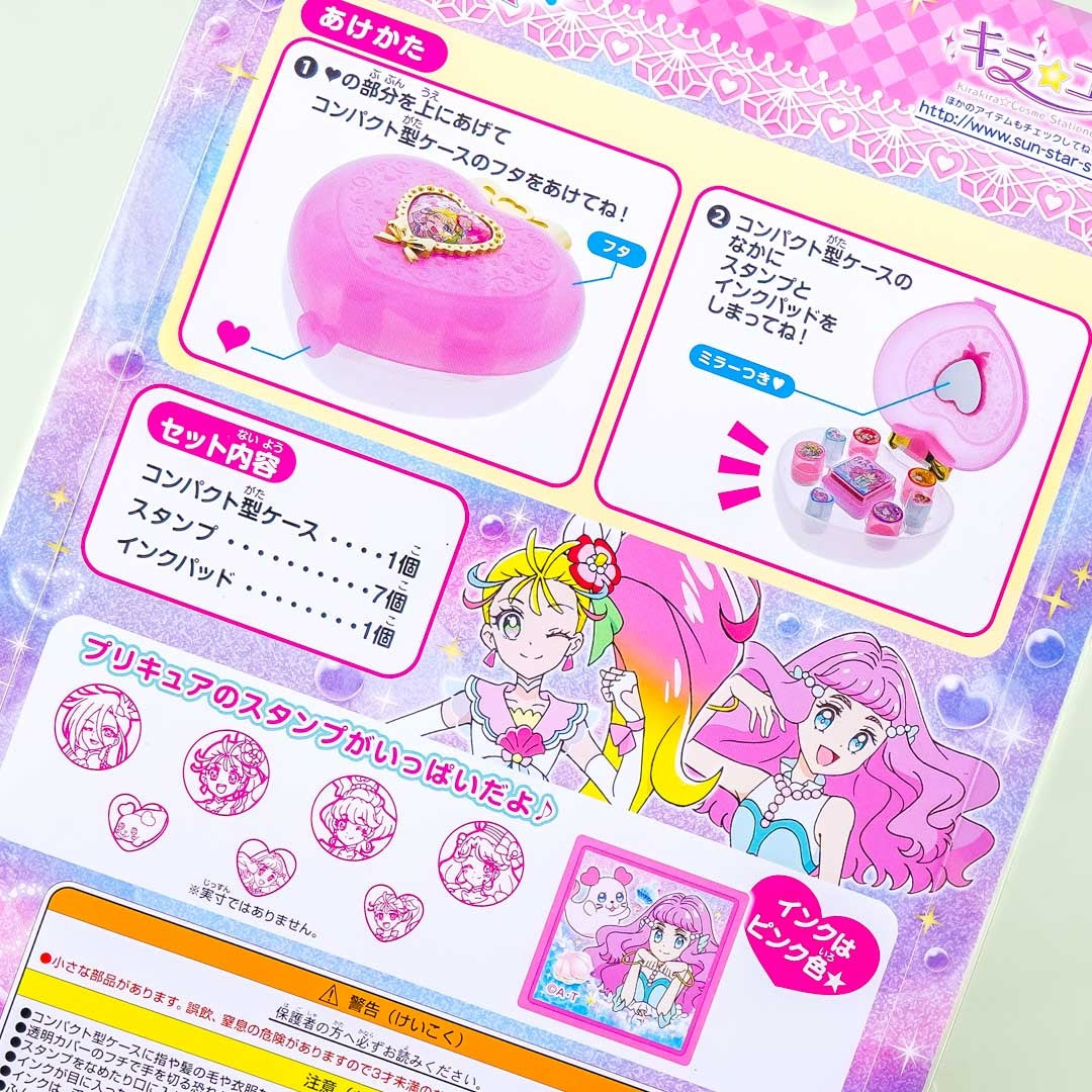 Have fun stamping letters and projects with this super kawaii stamp set featuring characters from the anime, Tropical-Rouge! Pretty Cure. This stamp set comes complete with multiple stamps, an ink pad, and a heart-shaped bejeweled case.