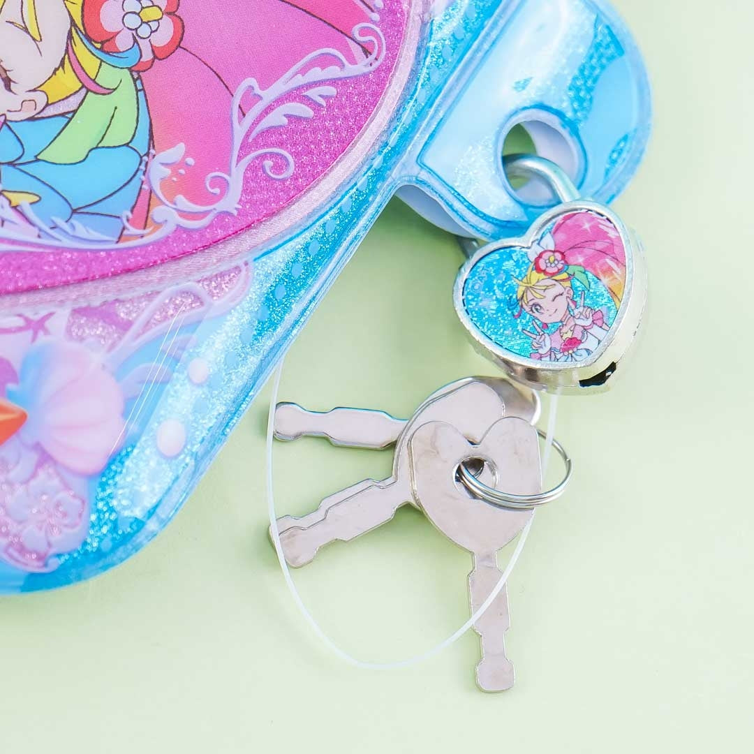 Write down your secrets on the lined and illustrated pages of this super kawaii diary featuring prints of the characters from Tropical-Rogue! Pretty Cure. This diary has a lock with four keys so your secrets stay safe! It has a glittery cover and it comes with two bejeweled heart stickers.