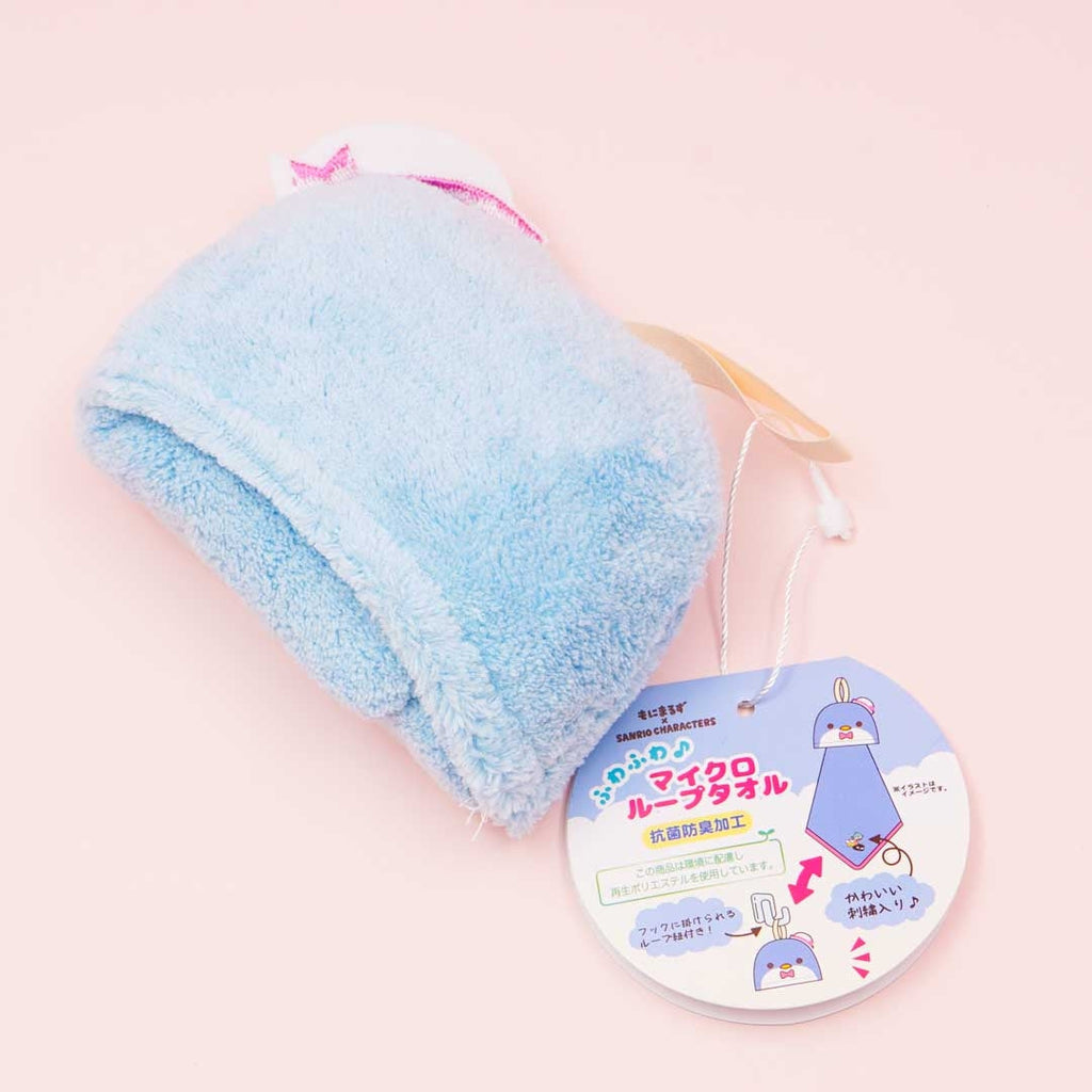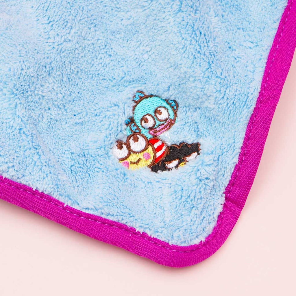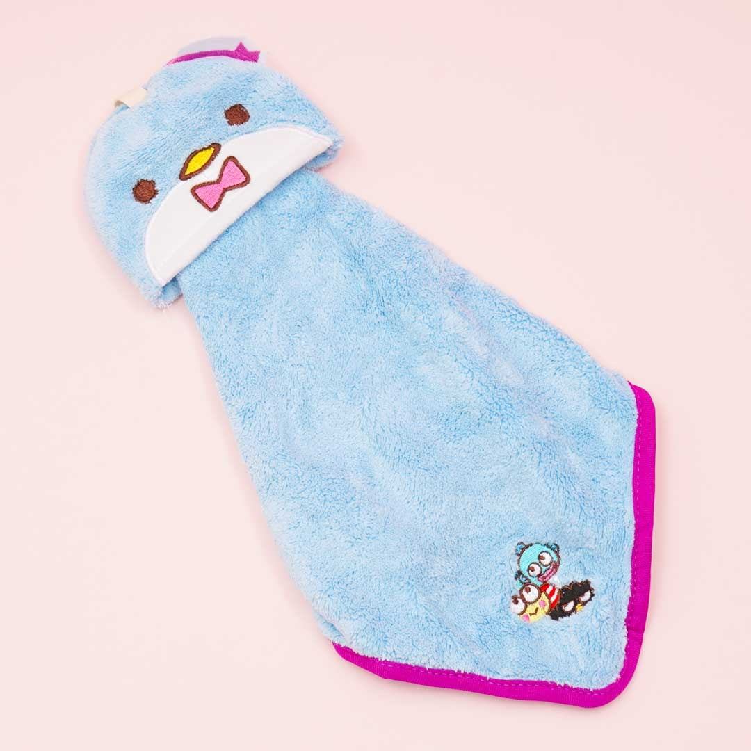 Bring this soft microfiber towel to wipe the sweat off while you’re outdoors! It has a convenient cloth loop and a mini embroidery of Keroppi, Hangyodon, and Bad Badtz-Maru. When you’re done using it, roll it up and place it inside the Tuxedosam head attachment! This cute towel underwent deodorant and antibacterial treatment to prevent bacterial growth and unpleasant odors.