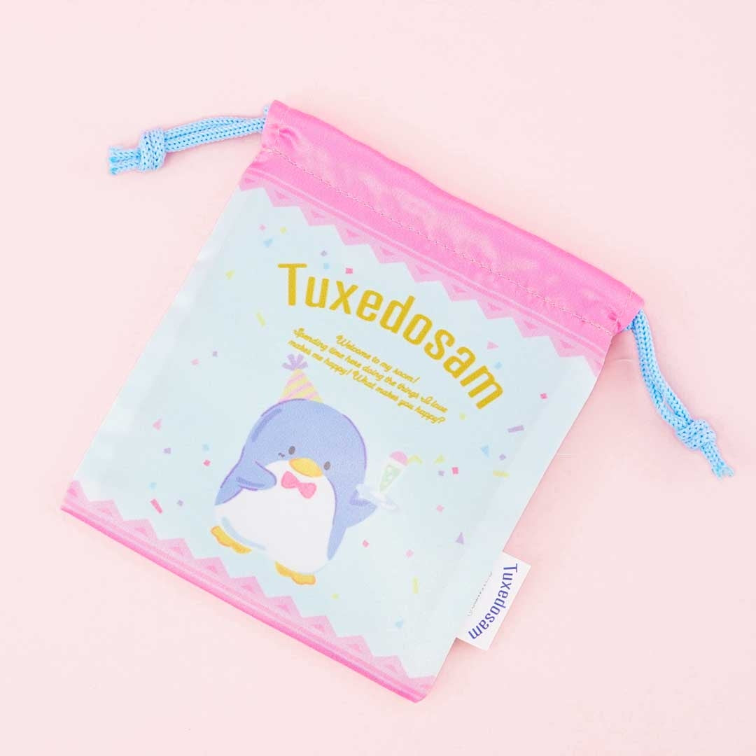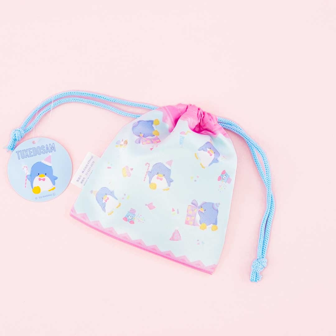 This cute pouch is decorated with a print of Tuxedosam carrying a parfait at a party! Use it to organize your knick-knacks. It has a pull-string closure that helps keep your things safe and secure.