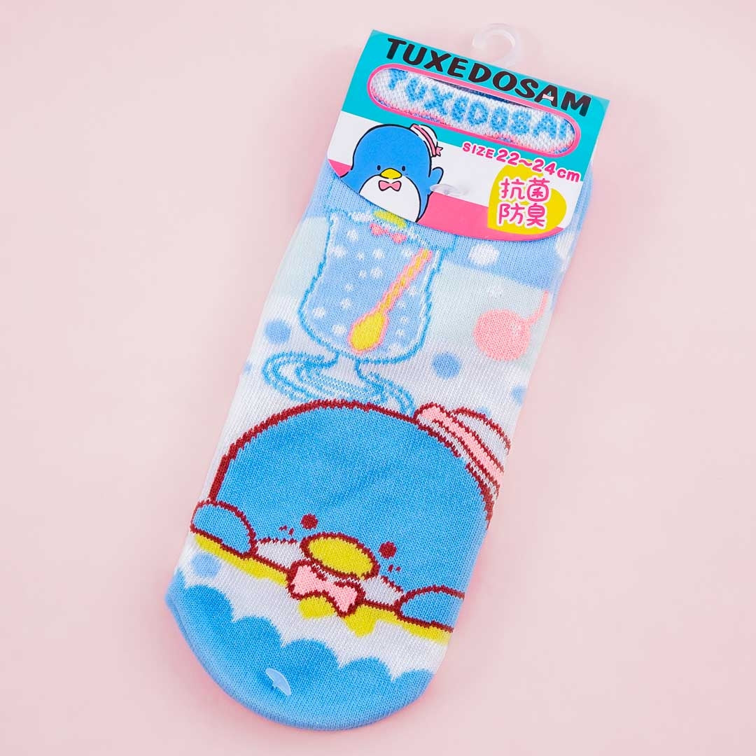 A kawaii pair of jacquard socks decorated with illustrations of Tuxedosam and a glass of sparkling soda