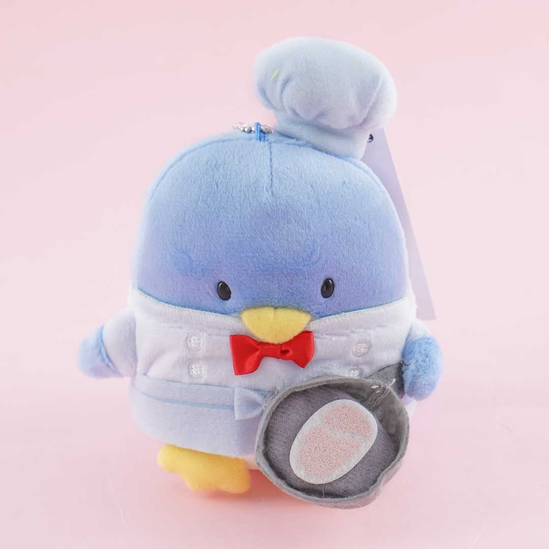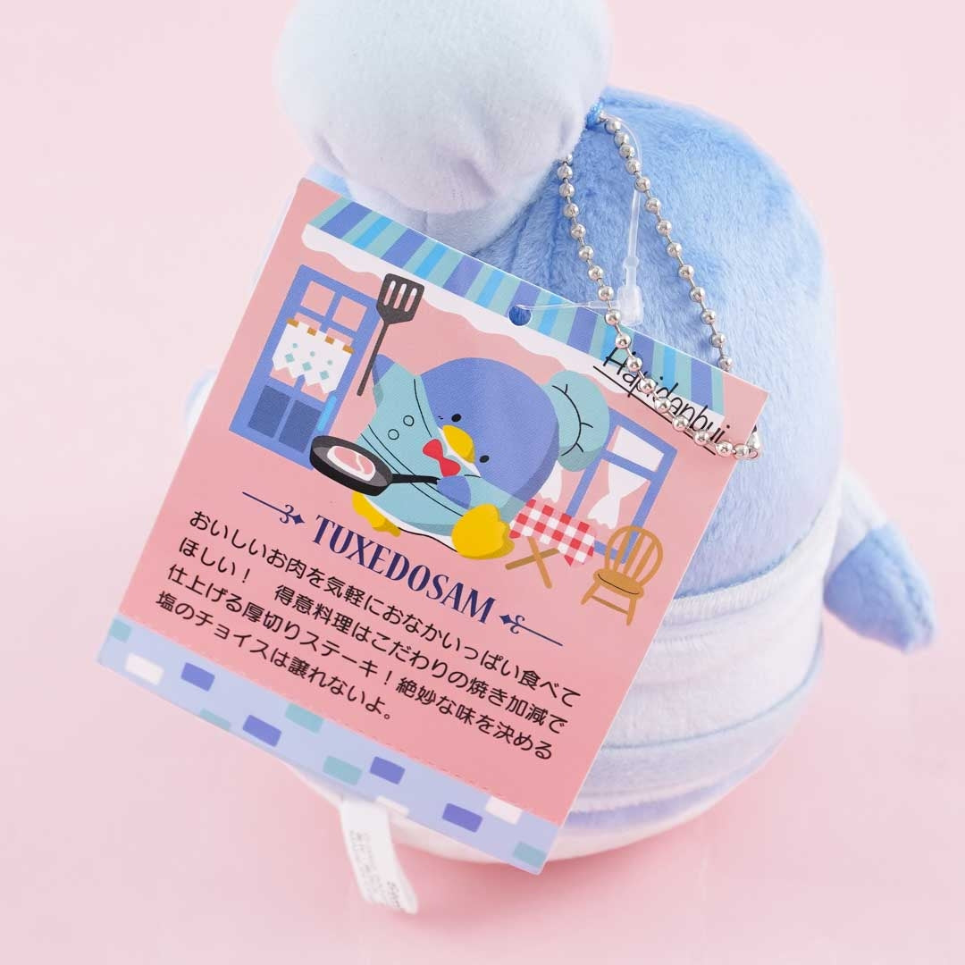 Tuxedosam is wearing a cute chef's attire and trying to cook a steak! You can hang this kawaii medium-sized plushie on your backpack with its detachable ball chain.