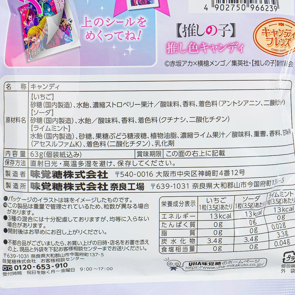 This pack of ball-shaped candies features cute illustrations from the manga series, Oshi no Ko. Each candy is painted with the characters' favorite colors! The aqua candy is soda-flavored, the ruby candy is strawberry-flavored, and the white candy is lime mint-flavored. This pack also comes with a sticker featuring the kawaii characters!